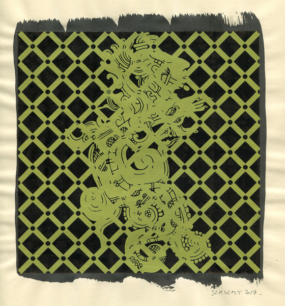 - 1 - 25, Shakti-Yoni, Ecstatic Cosmic Dances, acrylique sérigraphiée et encre de chine sur papier jaune Wang Sketching 80g & sur papier Rives B.F.K, 280g, encadrés 38 x 37.5 cm, 2017.