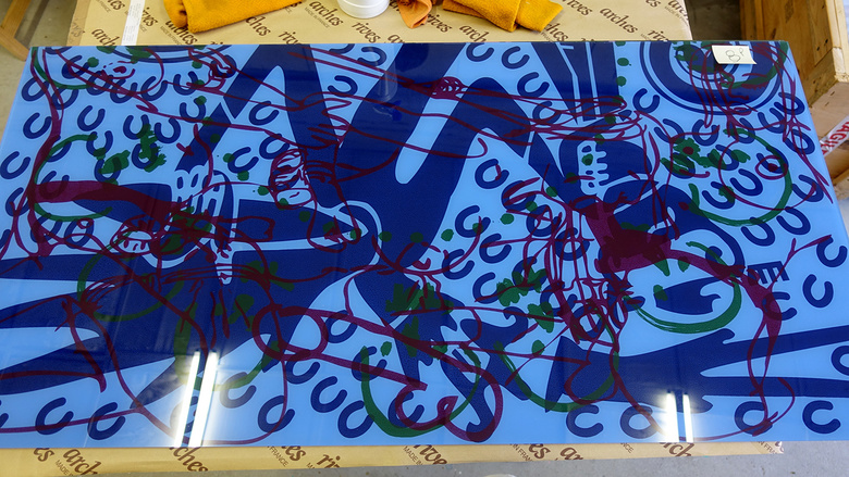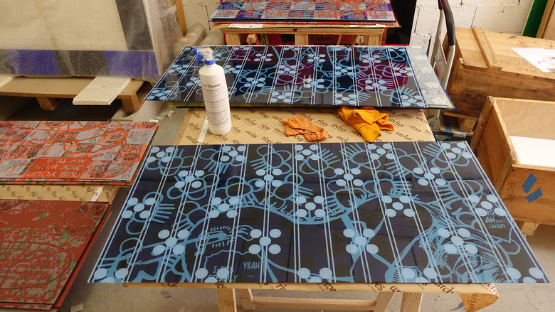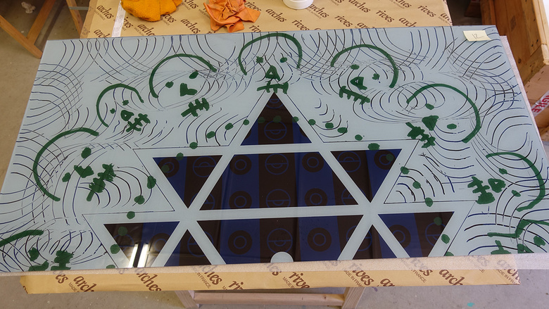 - NB : Cette installation est en quelque sort la matérialisation d'un projet imaginé à New York en 1995, d'un espace cubique à l'intérieur duquel seraient accrochées d'innombrables peintures sur Plexiglas et dans lequel on entrerait en-dessous par un escalier. Projet inspiré par ma visite, lors d'un voyage en Égypte, avec mon grand-père et ma sœur, par l'art funéraire égyptien. En particulier, par la visite de le tombe de la Reine Néfertari. Projet initial dont il ne manquerait que l'ajout du plafond du superbe ciel étoilé !