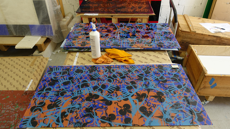 Soixante-douze peintures sur Plexiglas de format unitaire carré, d'un mètre cinq sur un mètre cinq, choisies parmi la série des Suites entropiques réalisées entre 2010 et 2015, sont installées sur huit panneaux se faisant face aux quatre angles des deux grands escaliers principaux du musée. Cette installation de taille monumentale de quatre-vingt mètres carrés, est à ce jour, la plus grande réalisée par l'artiste peintre franco-new yorkais.