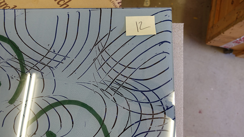 - Vue de l'installation Les quatre piliers du ciel, escalier nord, 2 x 18 peintures sur Plexiglas, photo de Lionel Georges, 14 octobre 2019.