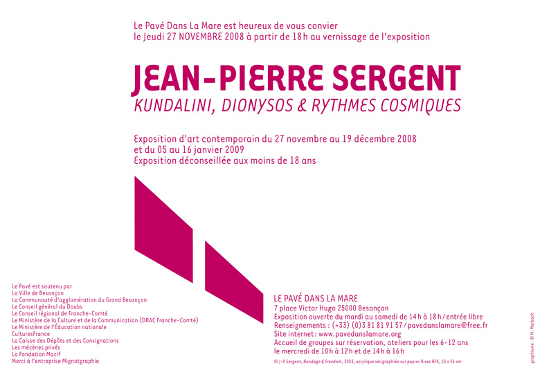 Le Pavé Dans La Mare a choisi d’exposer des dessins de petits formats (25 x 25 cm), sérigraphies sur papier tirés des séries "Bondage and Freedom" et "Dionysos" réalisées à New York entre 1998 et 2003. Tout comme les séries monumentales sur Plexiglas, ces dessins s’inspirent d’un même intérêt pour le multiculturalisme; sont superposées des images érotiques voir pornographiques provenants d'univers culturels diverses (graffitis, cultures Précolombiennes, mangas japonais, et site internet). Ces représentations d’une sexualité empreinte de violence, de douceur, d'humour et de beauté sont intéressantes pour la catharsis qu’elles opèrent sur le spectateur : "Cet instant magique où la souffrance ultime se transforme en Océan de plaisir". La série Dionysos évoque également la sexualité et les différents phénomènes sociaux s’y rattachant vue sous l’angle de la libido : "La violence érotique est à la fois naturelle et culturelle, les vases Grecs nous décrivent déjà cette folie, ce désir de renouveler l’univers en renouvelant le moi et la société dans un bain d’orgie dionysiaque. L’orgie a toujours eu un caractère sacré et paradisiaque comme dans la Genèse, quelque chose de primitif qui déstabilise les structures sociales établies et recentre le monde."