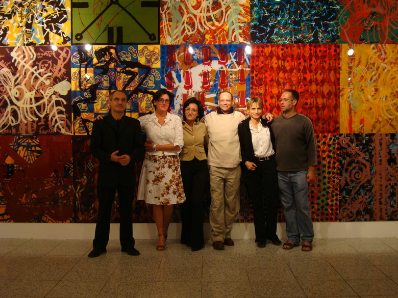 Vue de l’Installation murale monumentale Mayan Diary 24, septembre 2008, assemblage de 24 peintures acrylique sérigraphiée sur Plexiglas de 1,05 x 1,05 m, dimension totale : H 3,15 m, L 8,40 m.