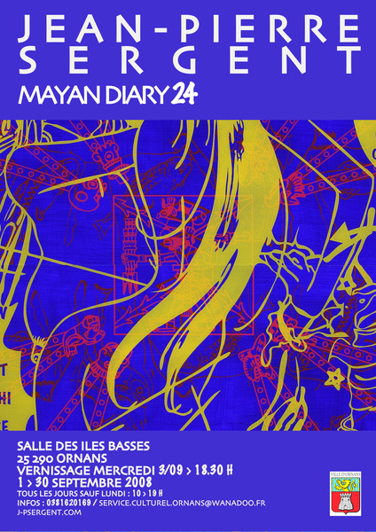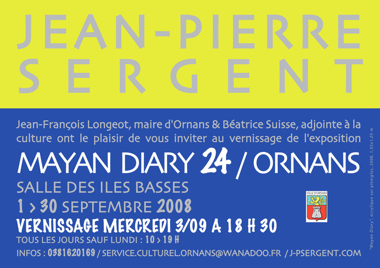 QUOI : Le service culturel de la ville d'Ornans invite Jean-Pierre Sergent à exposer dans la salle des Iles Basses d'Ornans. Présentation de "MAYAN DIARY 24" : 24 peintures sur Plexiglas de la série "Mayan Diary" réalisées à New York, 2001-2003. Accrochage sur le mur principal de 24 modules carrés (1,05 x 1,05 m.) créant une installation murale picturale monumentale de 8,40 m. de long par 3,15 m. de hauteur. Ceci est à ce jour la plus grande installation murale réalisée par Mr Sergent. Présentation également de plusieurs travaux sur papier des séries : "Beauty is Energy", 2000-2003, "Sky Umbilicus", 2006", "Lady of the Mask", 2007.