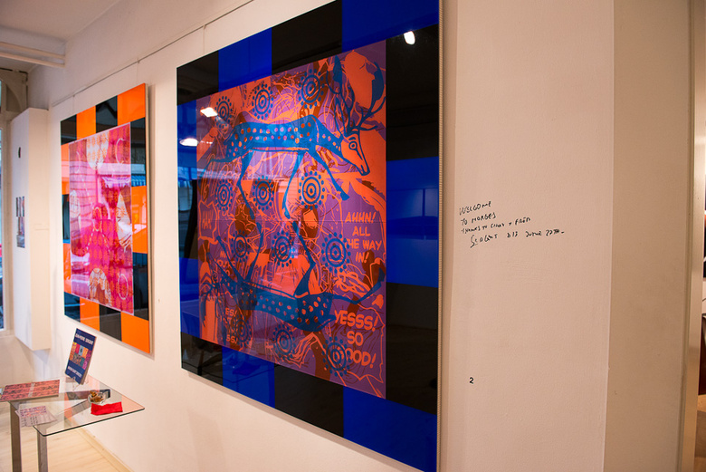 - 1 > 5 - Suite Entropique, acrylique sérigraphiée sur Plexiglas, 1,40 x 1,40 m, 2009-2011- 6-7 - Sky Umbilicus, acrylique sérigraphiée sur papier Rives B.F.K., 90 x 70 cm, 2006