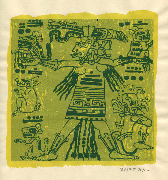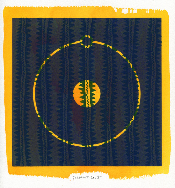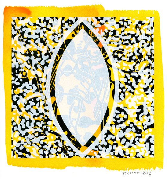- 1 - 25, Shakti-Yoni, Ecstatic Cosmic Dances, acrylic hand silk-screened on yellow Wang paper 80g & white B.F.K. Rives paper 250g, 38 x 37.5 cm, 2017.