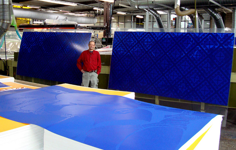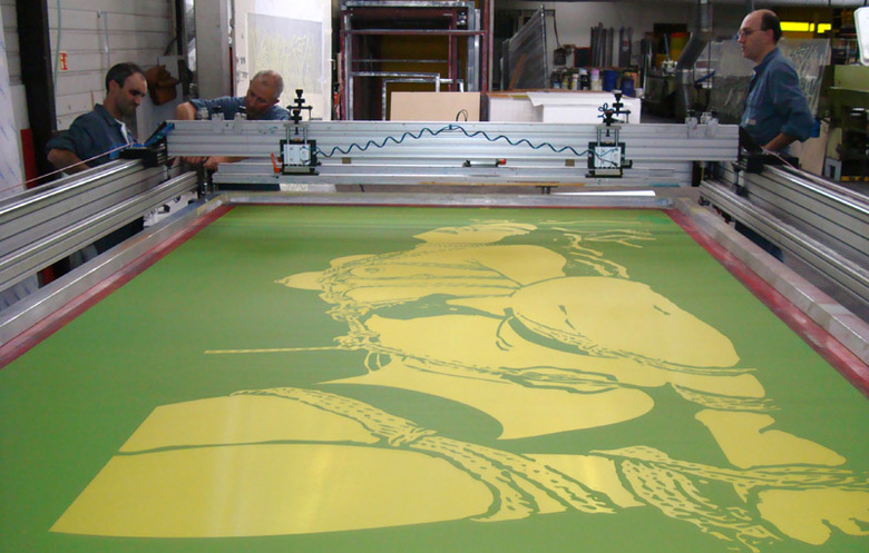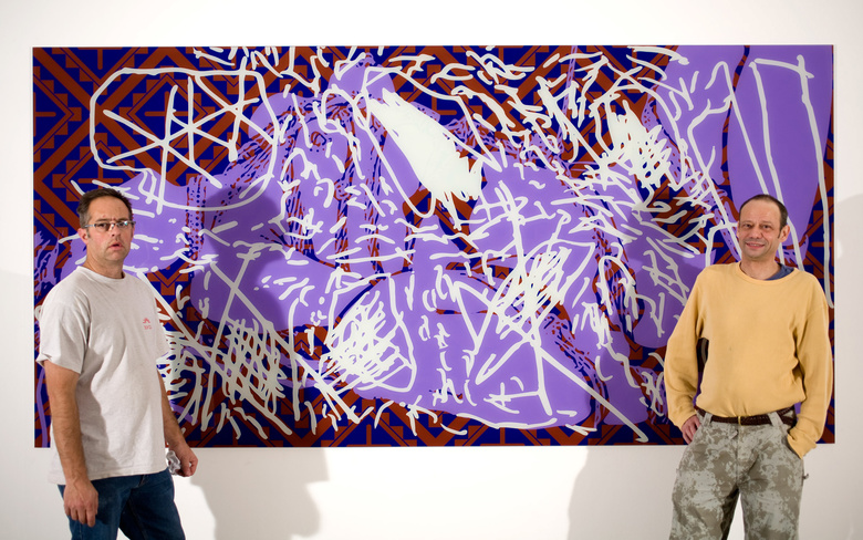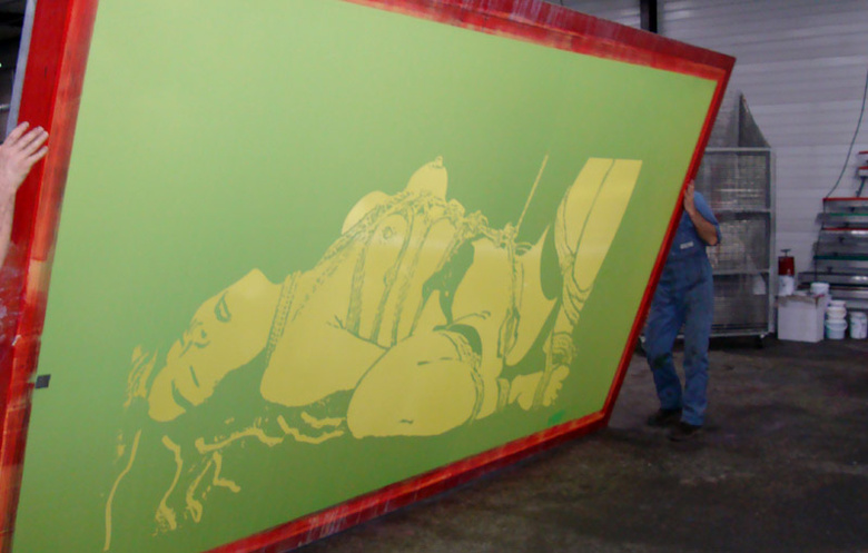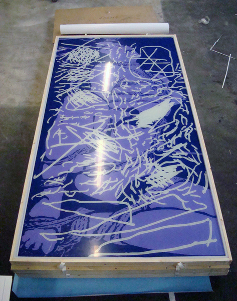 in the fall 2008, Jean-Pierre Sergent realized a large piece, silkscreen on Plexiglass, "Gribouillis, Bondage et Géométrie Sacrée", 10' x 5', edition of 4 and severals unique works on paper at the Mignotgraphie factory. For an exhibition at the Galerie du Pavé dans la marre, Besançon, France.