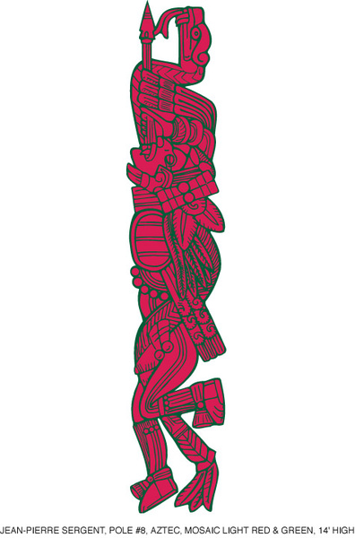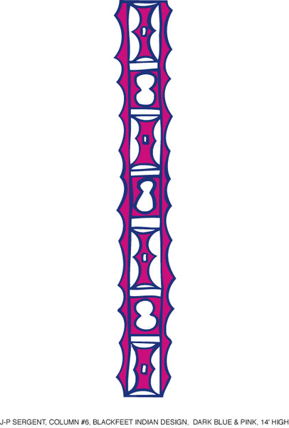 Site #4: the 12 Columns is a wall composed of different vertical designs related to different cultures its purpose is to lift up the space as well as to give people a sense of identity, in a city where every one is losing their connection to earth and cultural roots. Each column, pole or totem is placed in the middle of the space between the iron beams, that are giving rhythm to this design on this wall. Those beams have to be painted in red fire color.