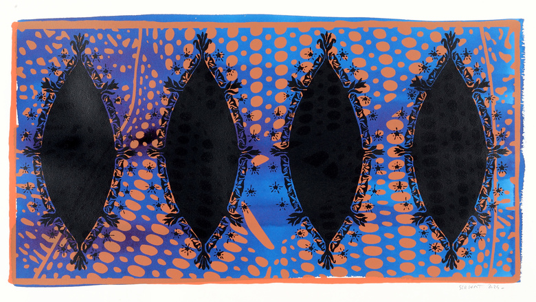 New series of 266 Karma-Kali, Sexual Dreams & Paradoxes, acrylic hand silk-screened and Indian ink on Rives BFK white (250g) & cream (160g) papers, unique print, format 76 x 56 cm, 2024