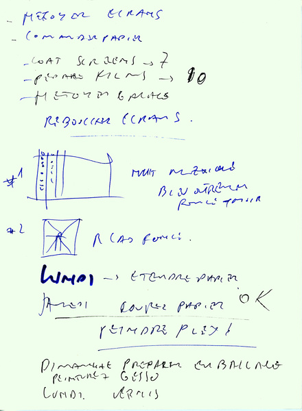 The Sketches are working notes and drawings for layering the colors and shapes of the paintings to be realized. Also memories of art pieces or patterns encountered in Museums, as well as conceptual thoughts about the meaning of my work. They are also drawn during the working process and are traces of my time schedule studio's organization, because silkscreen printing process requires a lot of different stages like cutting the rolls of paper, cutting the ruby films, cleaning and exposing the silkscreen frames, choosing the colors and scheduling the printing, shooting the paintings etc...