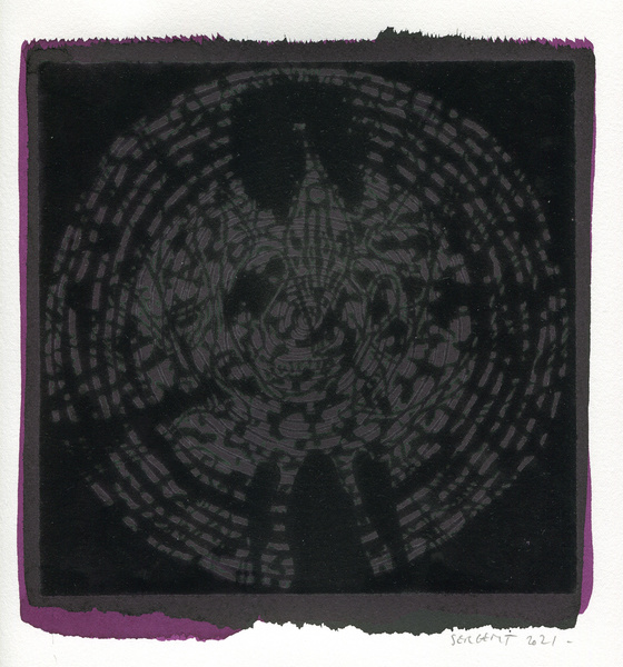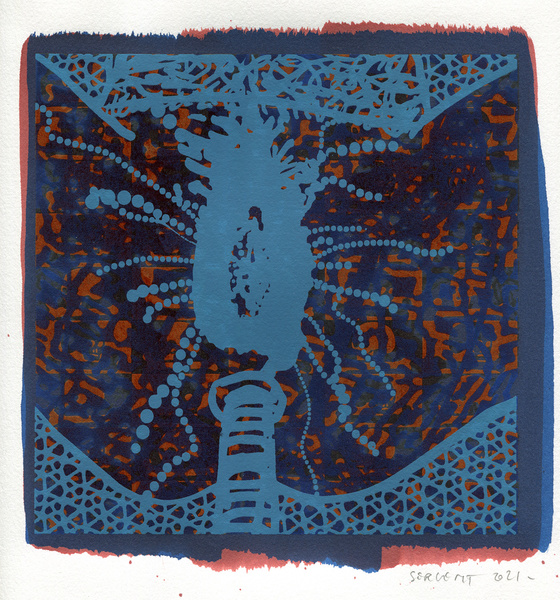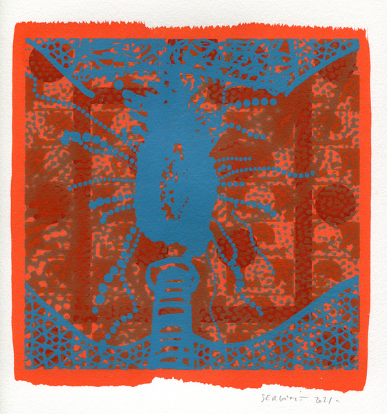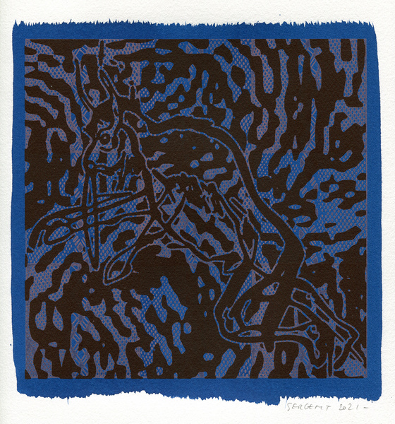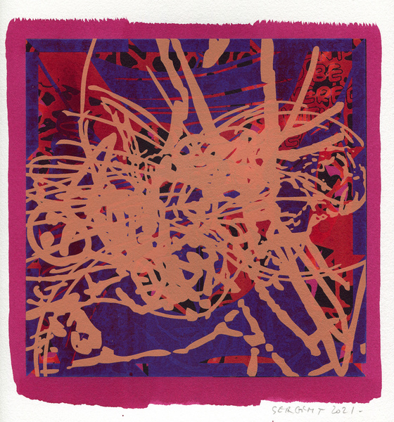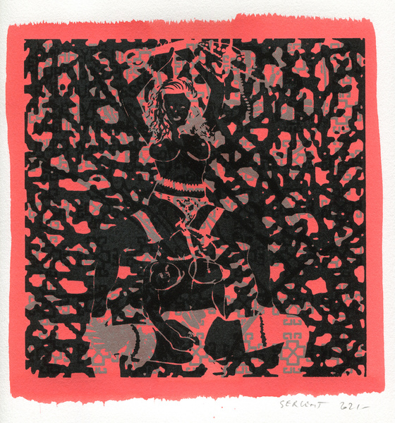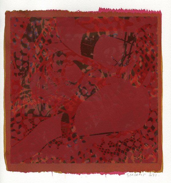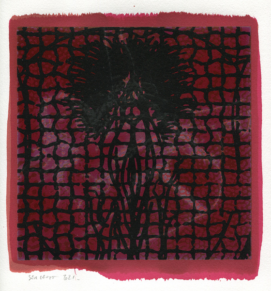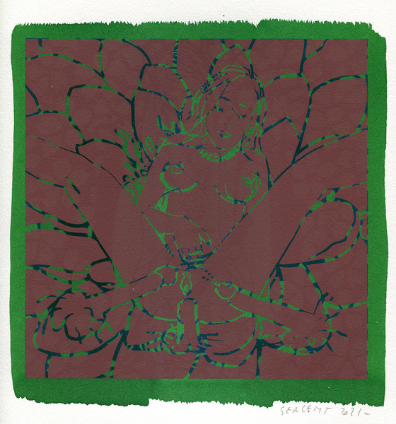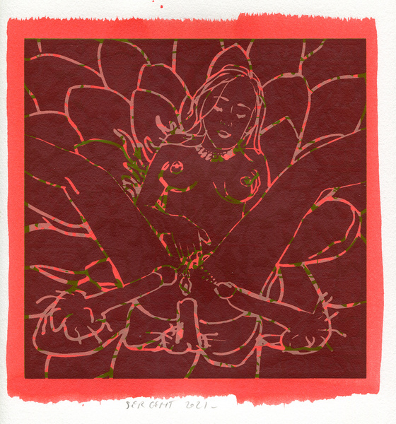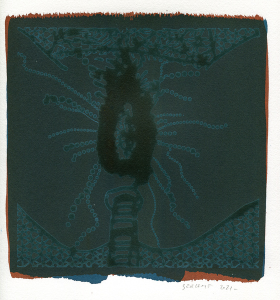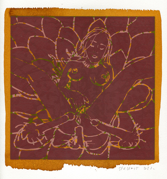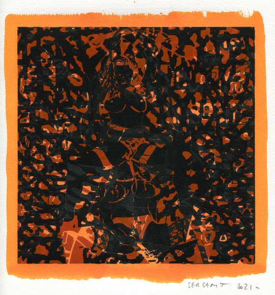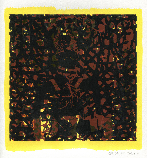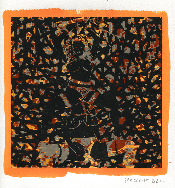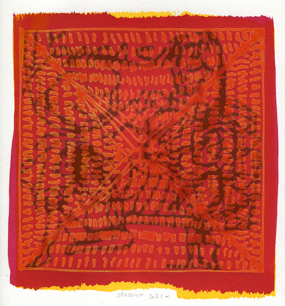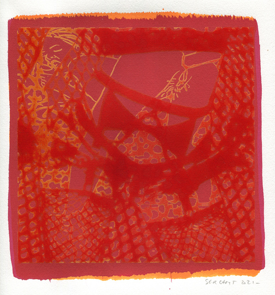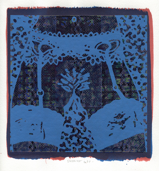 "Shakti-Yoni, Ecstatic Cosmic Dances", acrylic hand silk-screened and Indian ink on rives BFK paper 250g, unique print, 25,5 x 25,5 cm, 2021