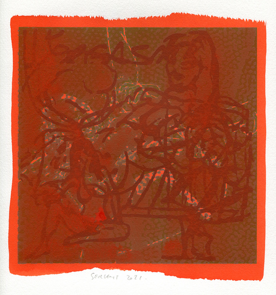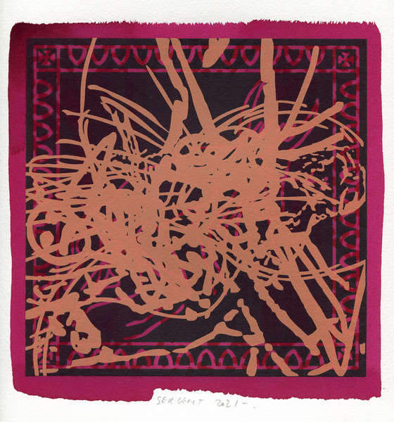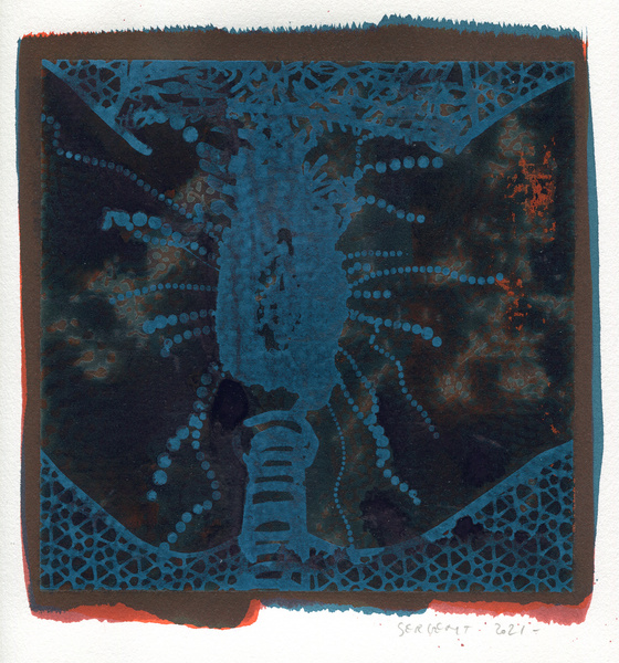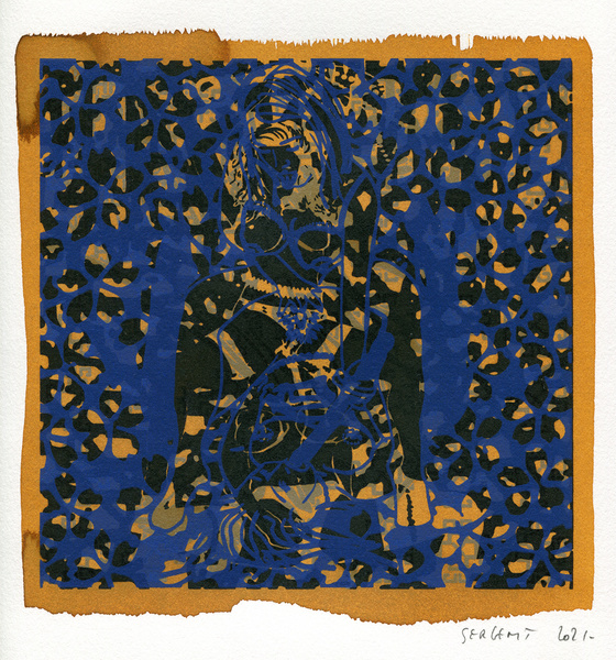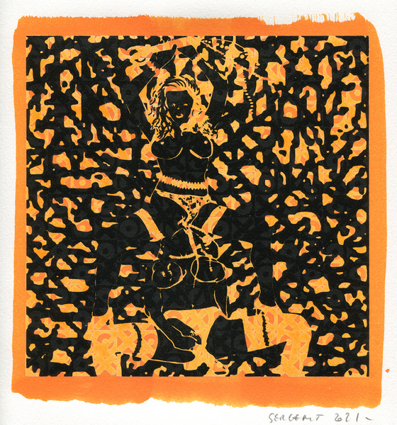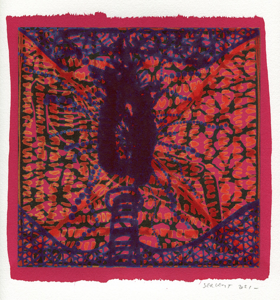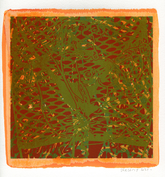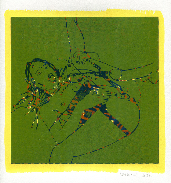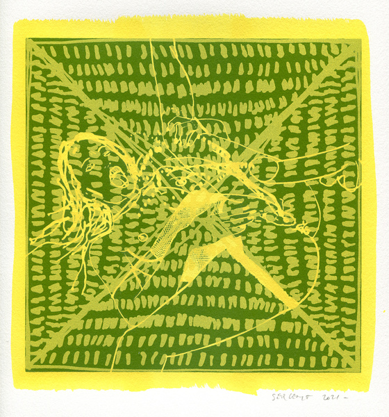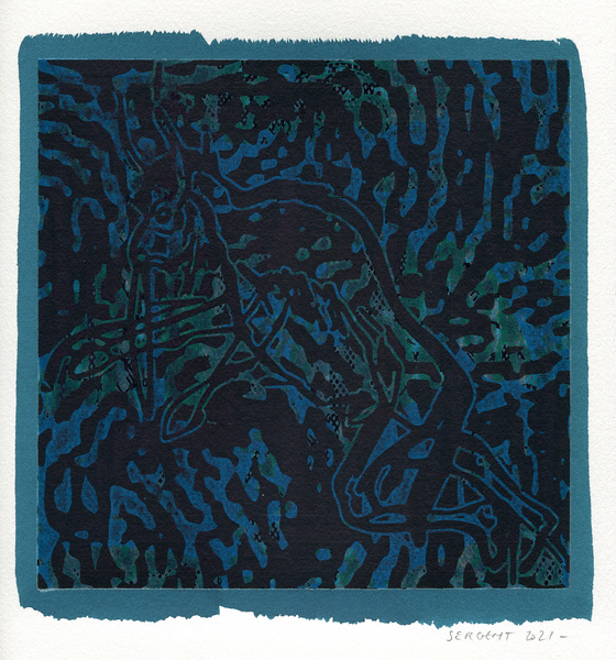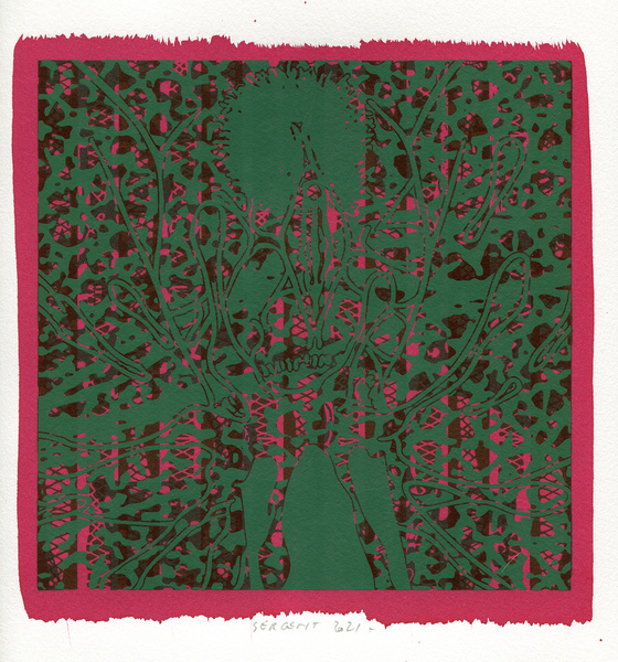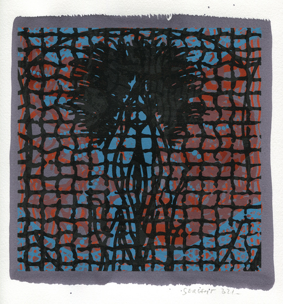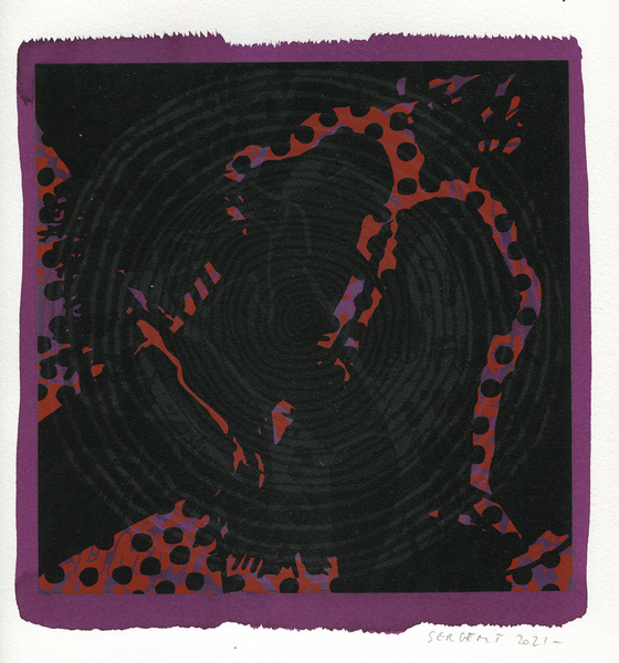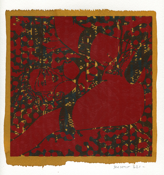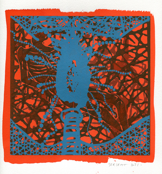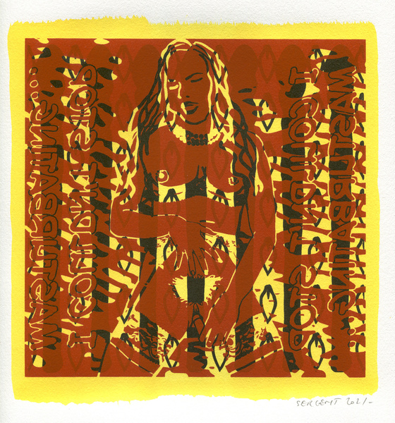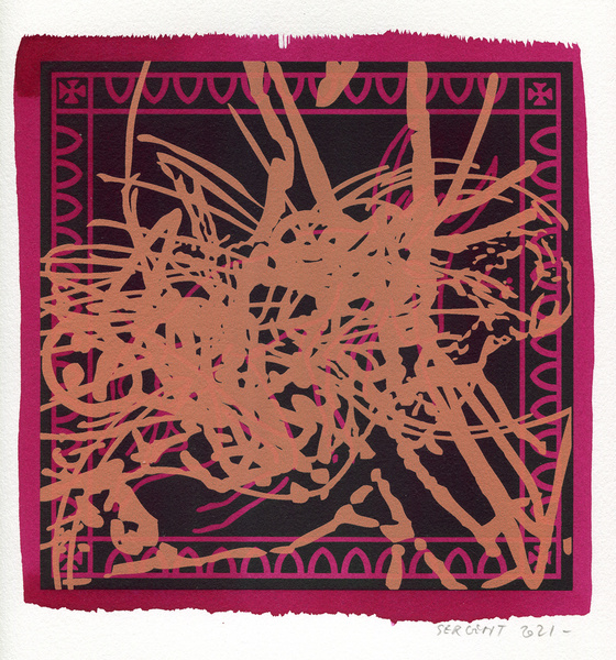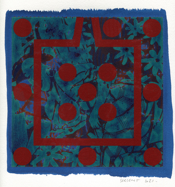 "Shakti-Yoni, Ecstatic Cosmic Dances", acrylic hand silk-screened and Indian ink on rives BFK paper 250g, unique print, 25,5 x 25,5 cm, 2021