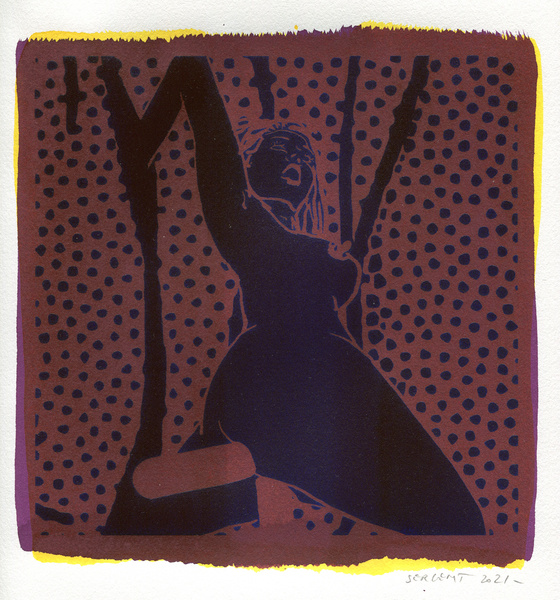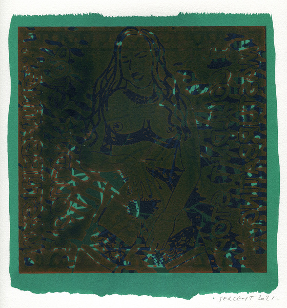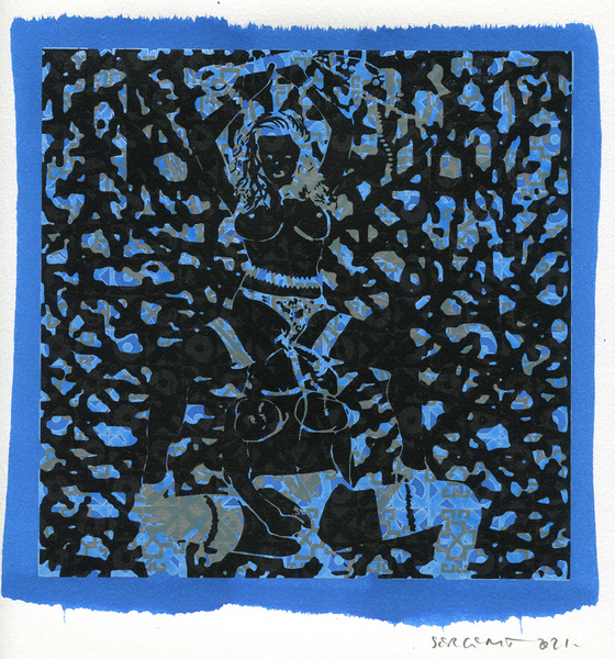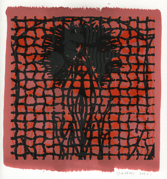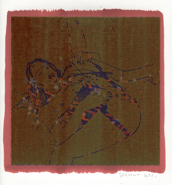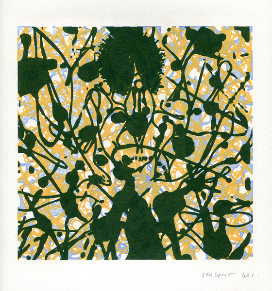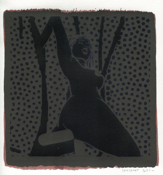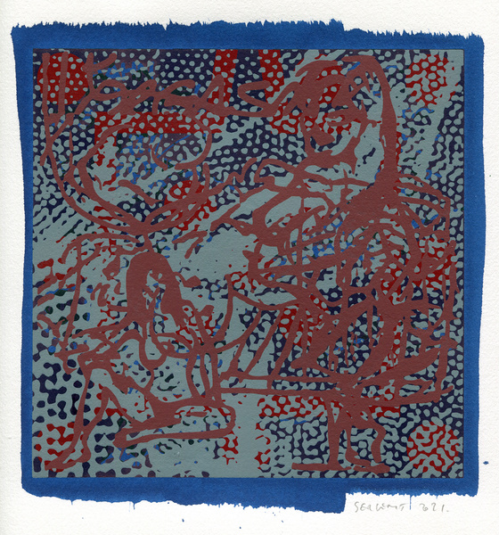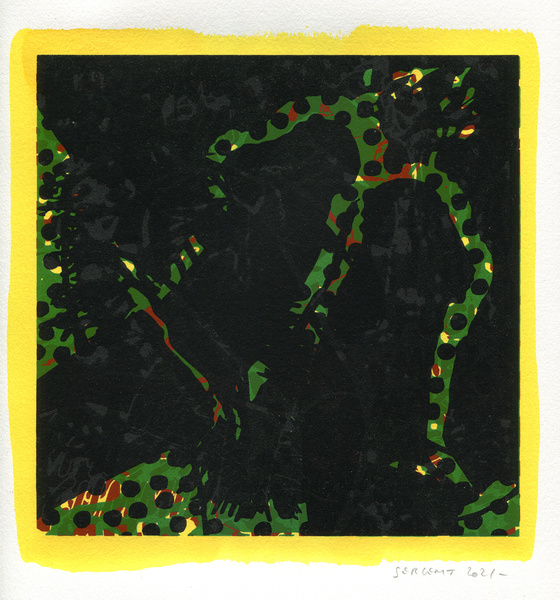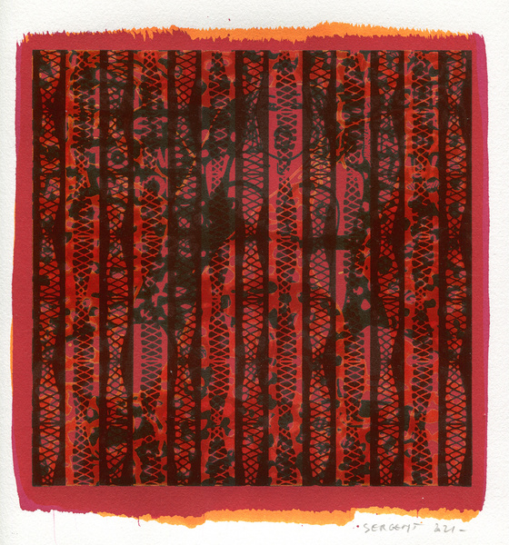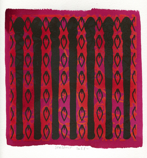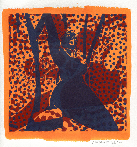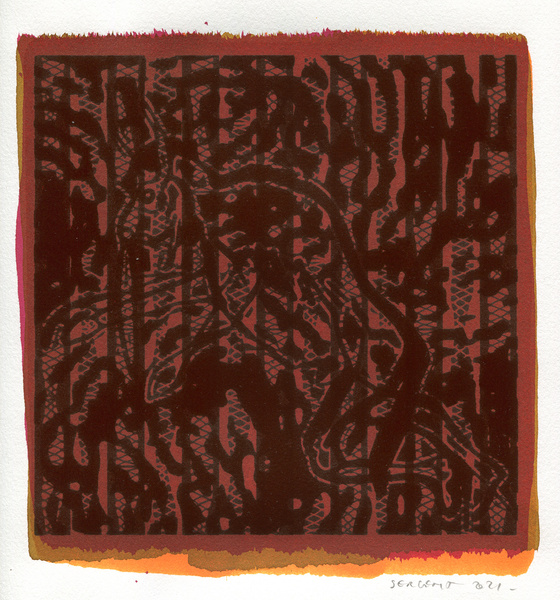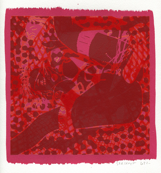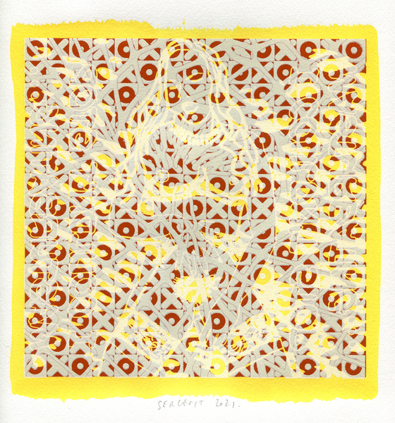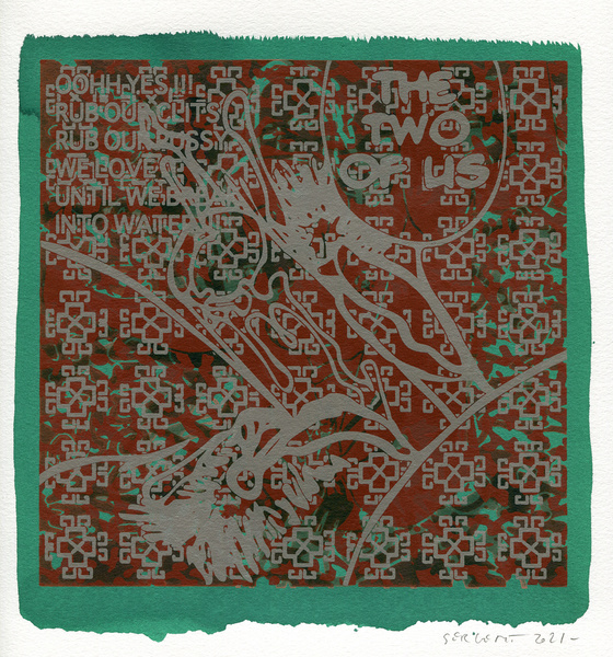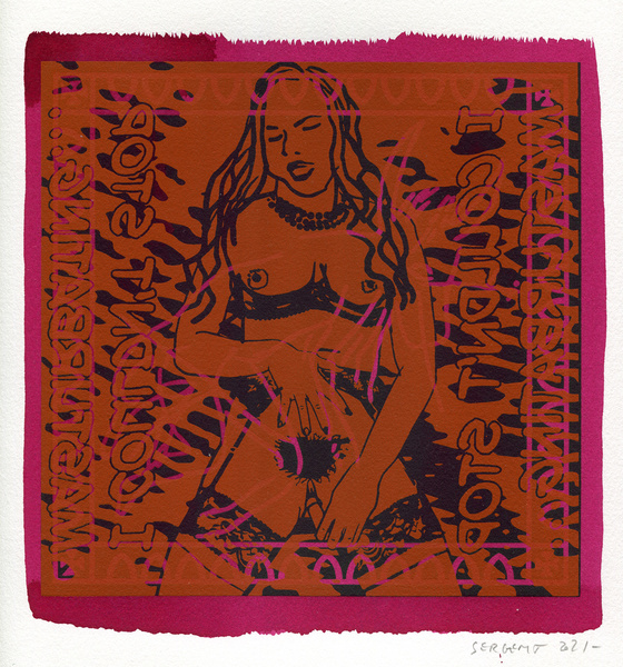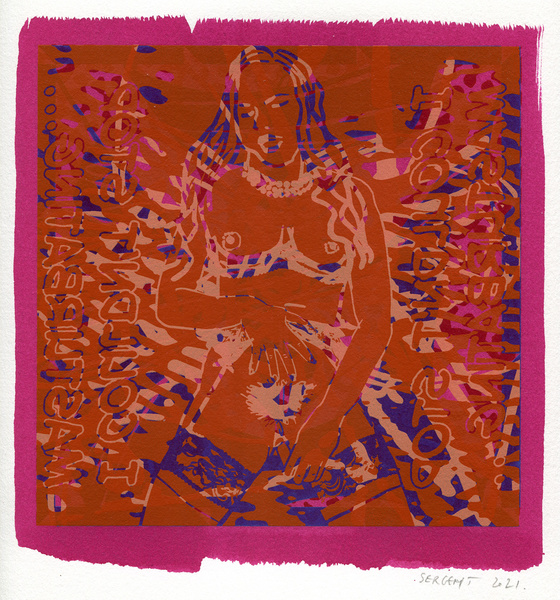 "Shakti-Yoni, Ecstatic Cosmic Dances", acrylic hand silk-screened and Indian ink on rives BFK paper 250g, unique print, 25,5 x 25,5 cm, 2021