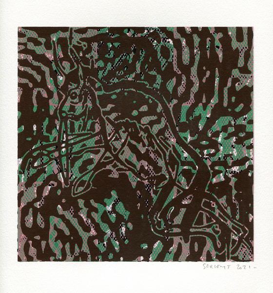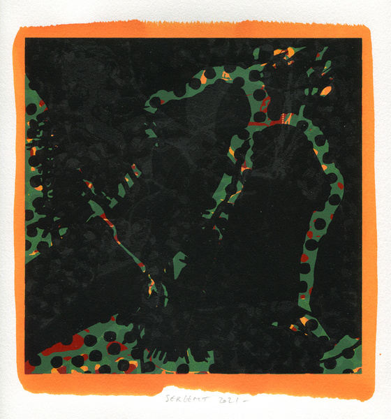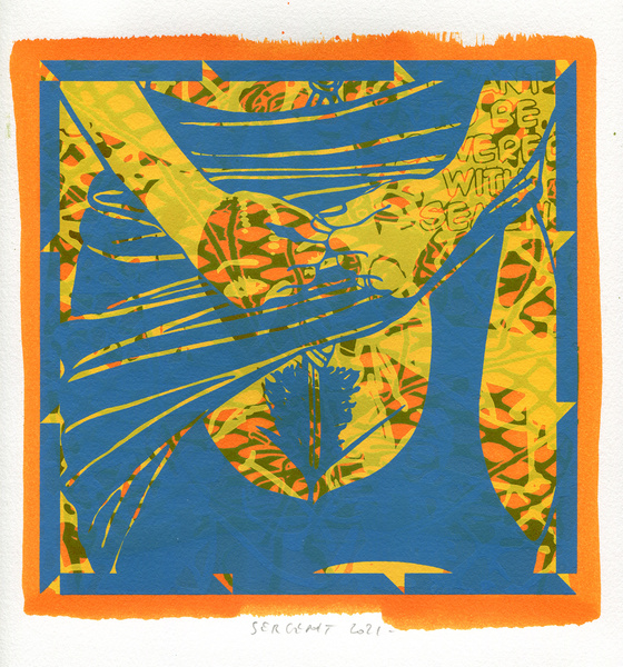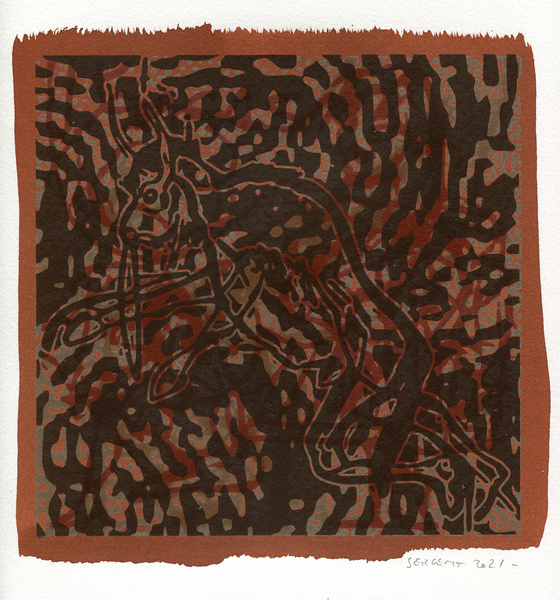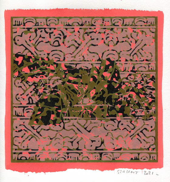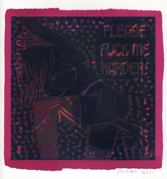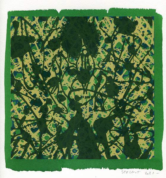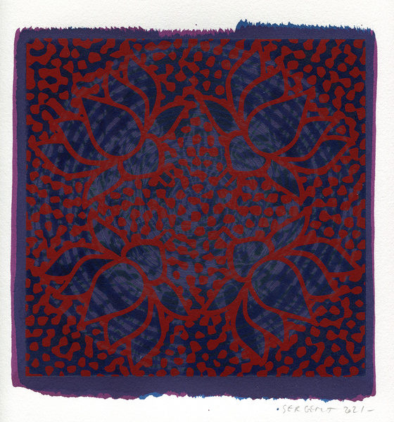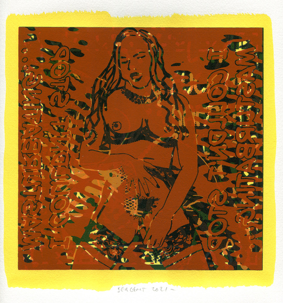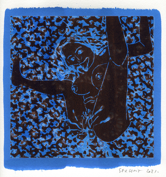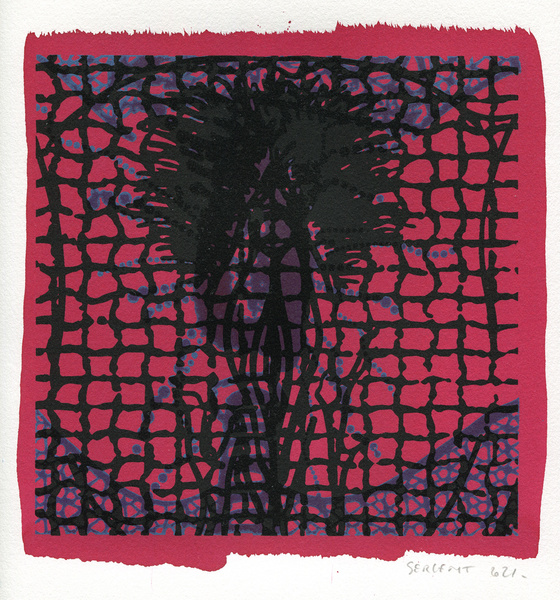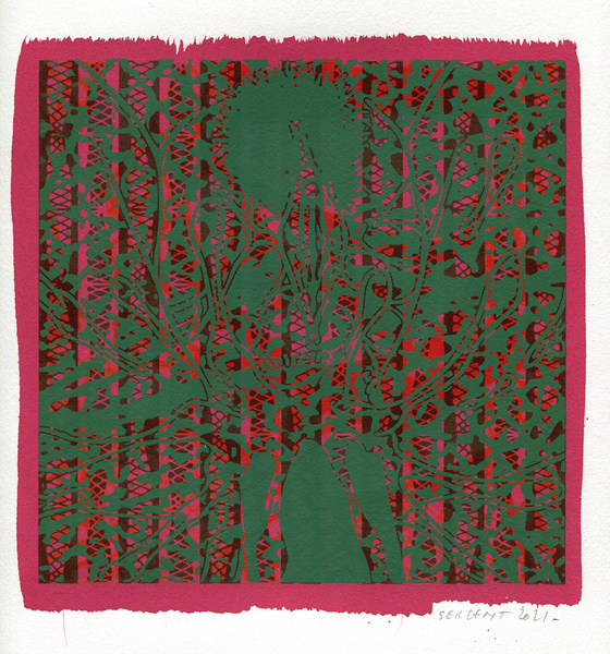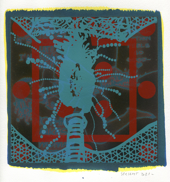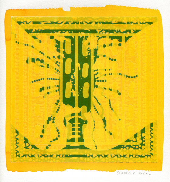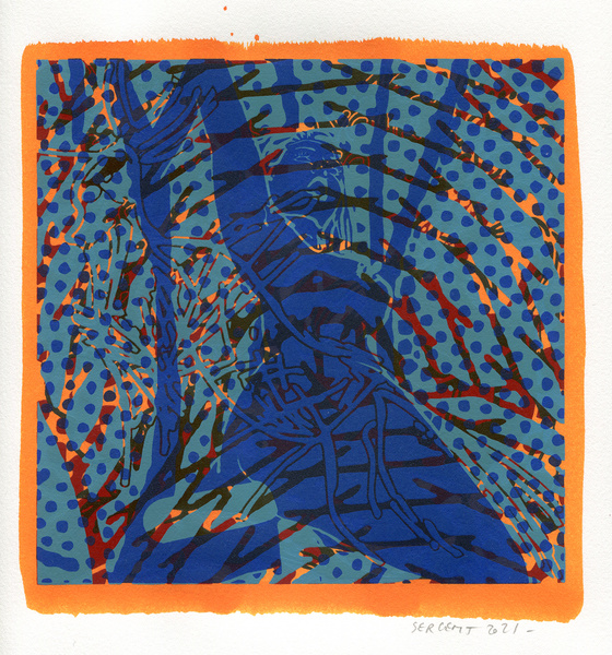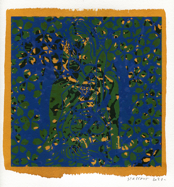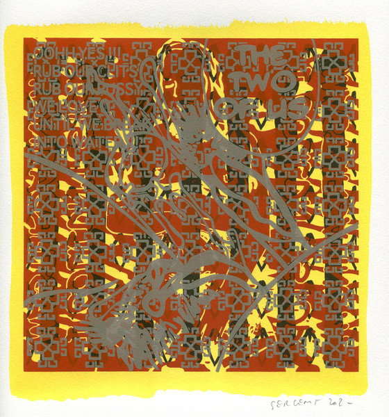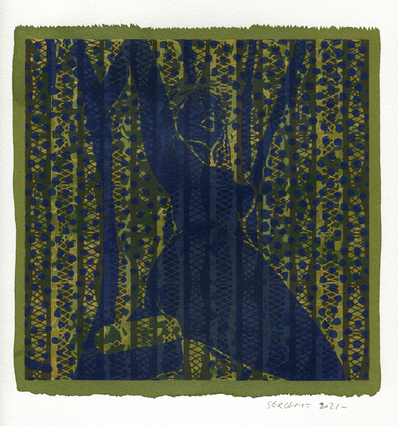 "Shakti-Yoni, Ecstatic Cosmic Dances", acrylic hand silk-screened and Indian ink on rives BFK paper 250g, unique print, 25,5 x 25,5 cm, 2021