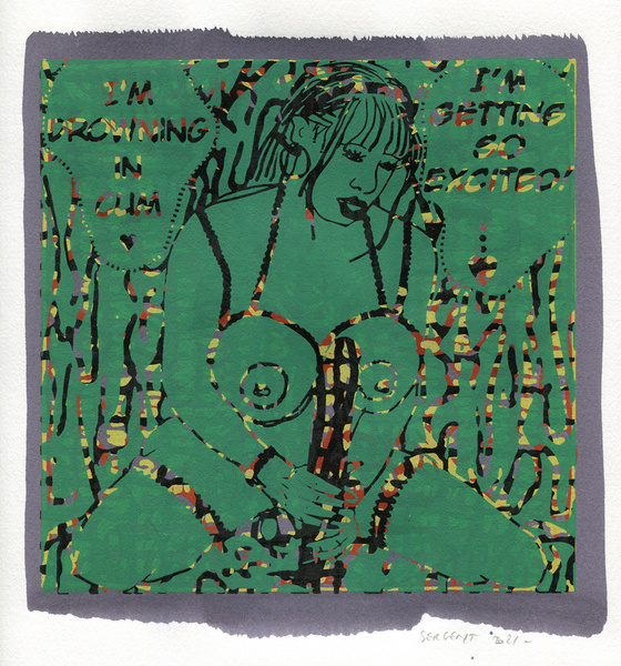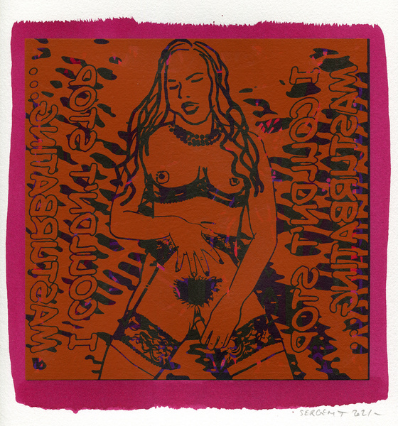 These bodies of women ecstatically dancing, like the exctatict dancing Dervishes Turners, are both fixed points here, and infinite there. They drag us with them in whirling and cosmic dimensions, creating in a true sense vortices of energies towards the possibilities of other lives, other pleasures, other experiences. Most of the pictures come from erotic videos of Oily Micro Bikini Dancing, in which young female Japanese strippers, with oil lubricated bodies, dance while masturbating to the rhythm of obsessive techno music (alienating, mindless, binary and repetitive), squirming sexually, in a primitive, barbaric, archaic, Dionysian ritual. They present to us, ostentatiously and spasmodically, their breasts with erect nipples, their genitals and all their orifices (mouths, anuses, and vaginas). Their Yonis, moist, gushing, obscene, and wet, with gaping lips ... symbols of the female sex, which in the same way in India are adorned, fed, and coated with butter, flowers, and various offerings and always pierced by the lingam*, Herculean cock rising towards the sky… Genitals open, offered, desiring… those female warriors are hoping for a man’s cock and his cum, in such an exciting and regenerating homage danced as in Stravinsky’s Sacre du printemps, but, in this never-ending and eternal dance, there is no need to wait for the Seasons to come back in order to revive their humongous desires…! Hoping all the same, transcendent, orgiastic, animalistic, and tantric sexual love. During these trance-dances, they develop a hyper-feminine and hyper-sexual excitement, such as that of the energizing, enveloping, destructive, extraterrestrial, super-powerful, and oversized energy of the Female Shakti’s energy of desires; vibrations of full-body orgasmic waves, like burning fires of gushing love. Breasts and Yonis offered, open like endless wells where one would lose oneself to extinguish one's ego and insatiable desire, in an alienating and liberating spiral, hoping for these spiritual journeys, entwined with the Divine light, the All, the One. The same ones that follow the soul of the dead in the Buddhist Bardos in different worlds of the afterlife... Jerky movements, pulsing rhythmically, or arhythmically, in a despairing contemporary pornographic solitude, which still bring us back sometimes to the origin of being, primary energy, the first cries of the child brought into the world or the first orgasm. In the same way that the Water, the Sea, the Ocean, and the Universe, encompass, submerge, and nourish us like the orphans we are all today, since the Spirits and the Gods are dead; killed by those other than us! But the artist remains optimistic and he tirelessly pays tribute to the dance ... to Nature ... to the color ... and to the feminine energy of the Shakti-Yoni force...!