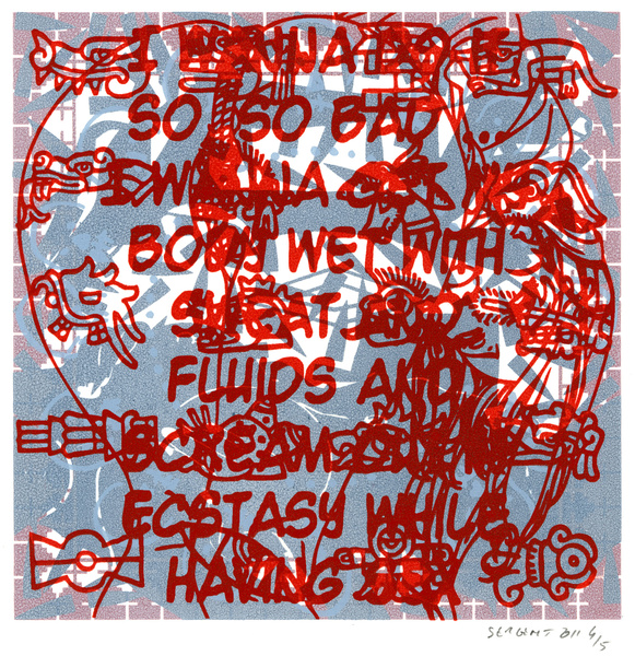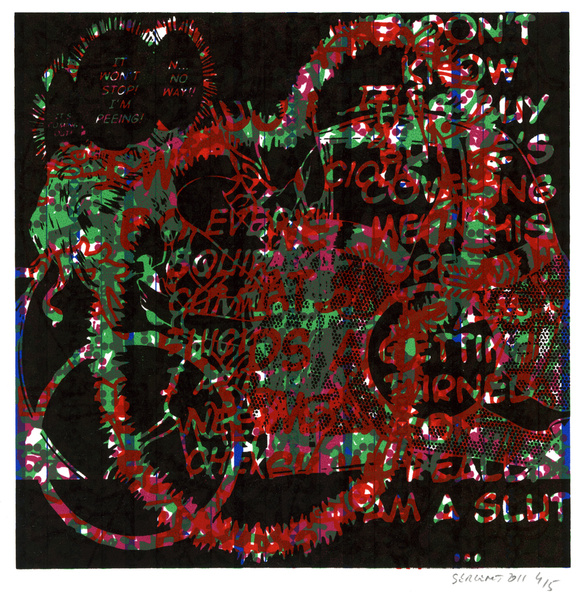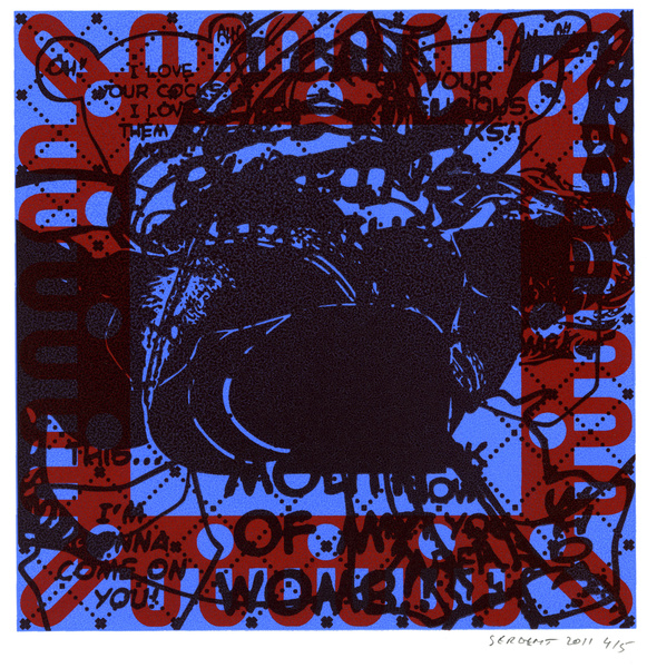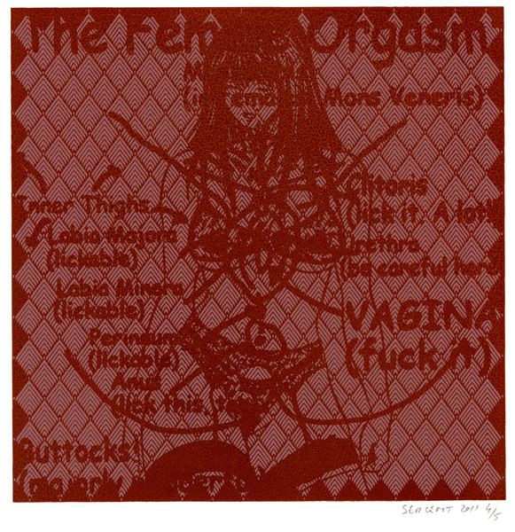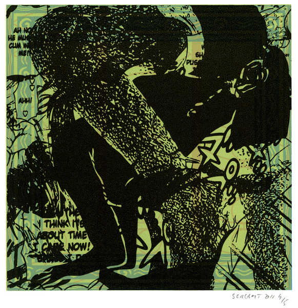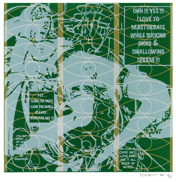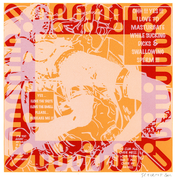 "Mangas*, Yantras* & Otras Cosas" serie started in 2009 in my Besançon studio's. It is printed mainly in monotypes and 5 editions of 15 prints, acrylic silkscreened on white, cream or gray B.F.K. Rives paper, 10''x10''. The print's images come mostly from Japanese mangas sexual cartoons, Hindus Yantras meditations drawings and genetics patterns from archaic cultures.
