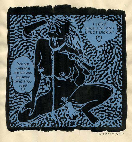 These bodies of women ecstatically dancing, like the exctatict dancing Dervishes Turners, are both fixed points here, and infinite there. They drag us with them in whirling and cosmic dimensions, creating in a true sense vortices of energies towards the possibilities of other lives, other pleasures, other experiences. Most of the pictures come from erotic videos of Oily Micro Bikini Dancing, in which young female Japanese strippers, with oil lubricated bodies, dance while masturbating to the rhythm of obsessive techno music (alienating, mindless, binary and repetitive), squirming sexually, in a primitive, barbaric, archaic, Dionysian ritual. They present to us, ostentatiously and spasmodically, their breasts with erect nipples, their genitals and all their orifices (mouths, anuses, and vaginas). Their Yonis, moist, gushing, obscene, and wet, with gaping lips ... symbols of the female sex, which in the same way in India are adorned, fed, and coated with butter, flowers, and various offerings and always pierced by the lingam*, Herculean cock rising towards the sky… Genitals open, offered, desiring… those female warriors are hoping for a man’s cock and his cum, in such an exciting and regenerating homage danced as in Stravinsky’s Sacre du printemps, but, in this never-ending and eternal dance, there is no need to wait for the Seasons to come back in order to revive their humongous desires…! Hoping all the same, transcendent, orgiastic, animalistic, and tantric sexual love. During these trance-dances, they develop a hyper-feminine and hyper-sexual excitement, such as that of the energizing, enveloping, destructive, extraterrestrial, super-powerful, and oversized energy of the Female Shakti’s energy of desires; vibrations of full-body orgasmic waves, like burning fires of gushing love. Breasts and Yonis offered, open like endless wells where one would lose oneself to extinguish one's ego and insatiable desire, in an alienating and liberating spiral, hoping for these spiritual journeys, entwined with the Divine light, the All, the One. The same ones that follow the soul of the dead in the Buddhist Bardos in different worlds of the afterlife... Jerky movements, pulsing rhythmically, or arhythmically, in a despairing contemporary pornographic solitude, which still bring us back sometimes to the origin of being, primary energy, the first cries of the child brought into the world or the first orgasm. In the same way that the Water, the Sea, the Ocean, and the Universe, encompass, submerge, and nourish us like the orphans we are all today, since the Spirits and the Gods are dead; killed by those other than us! But the artist remains optimistic and he tirelessly pays tribute to the dance ... to Nature ... to the color ... and to the feminine energy of the Shakti-Yoni force...!