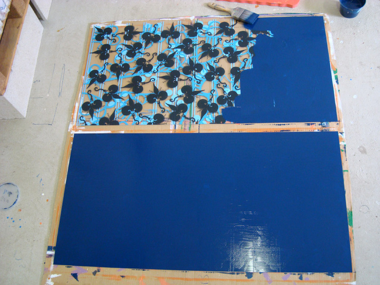 - 119 > 154, Painting 3 coats of monochrome acrylic color on the back of the Plexiglas panels with a brush.