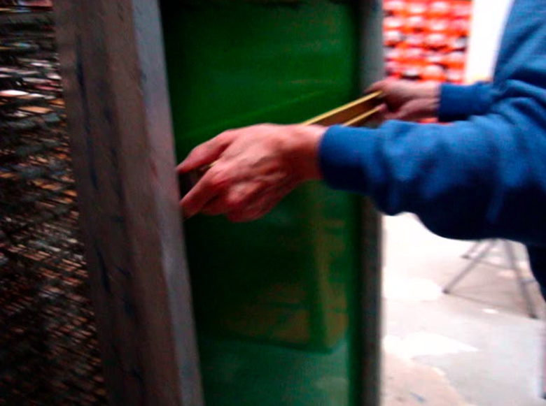- 47 > 55, Coating the silkscreen frames with light sensitive emulsion.
