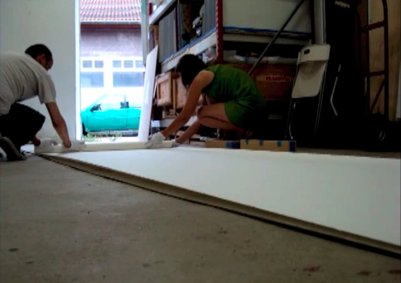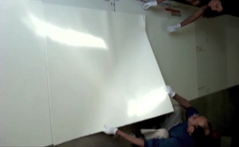- 1 > 7, Cutting in large rolls of BFK Rives paper into sizes: 1,20 x 1,07 m, with Christine Chatelet.
