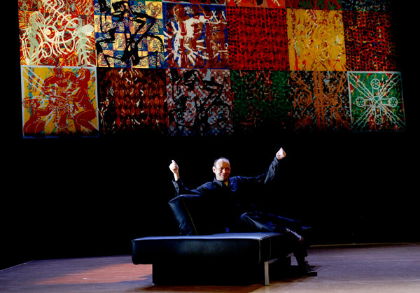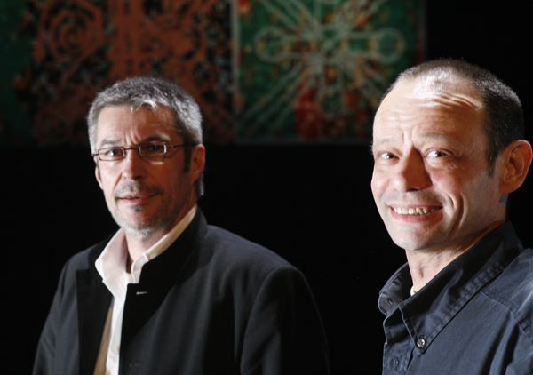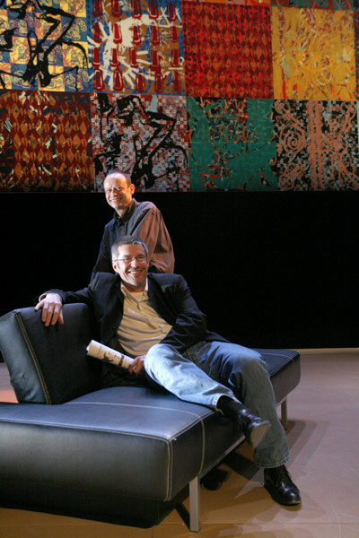 Photos by Yves Petit, Jean-Pierre Sergent in front of the set design of the Verdi's Traviata Opera, Didier Brunel producer, March 2007. Opera Theatre de Besançon