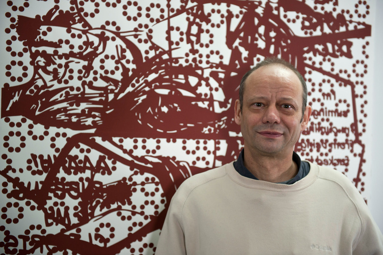 Jean-Pierre Sergent in front of his wall installation at the Besançon studio, August 27th 2016. Photo by Christine Chatelet
