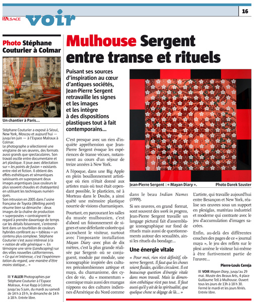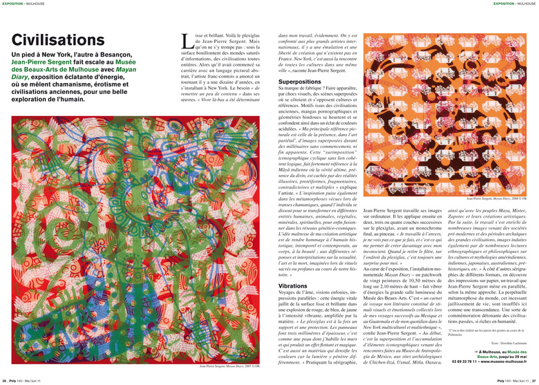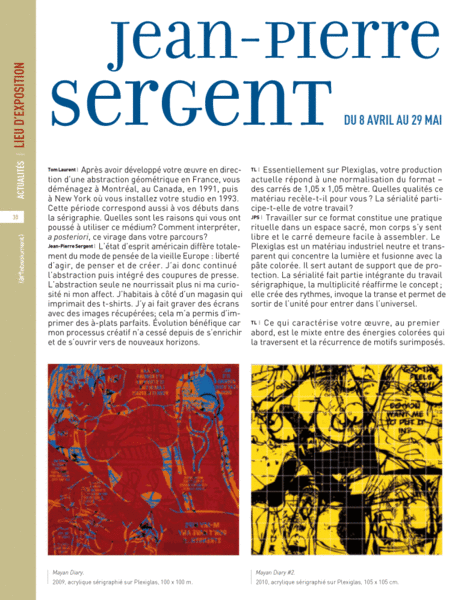 L’artiste plasticien Jean-Pierre Sergent, dont il a été question à plusieurs reprises dans ces colonnes, puise son inspiration dans la symbolique des cultures. Son procédé habituel, la sérigraphie sur papier ou sur Plexiglas, impose un travail en couches successives. Et ce sont, précisément, des couches successives de cultures qui se superposent dans ses créations. Graphismes aztèques ou mayas, yantras hindous, mais aussi mangas érotiques japonais se retrouvent ainsi interprétés sur une palette variée de couleurs souvent vives. L’énergie vitale qui en émane surprend les sens de l’observateur, lequel découvre, enfoui en lui, un rapport à l’univers aussi surprenant que singulier.