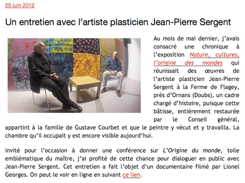 Lors d’une visite, la veille du vernissage, nous avons, avec Jean-Pierre Sergent, improvisé quatre courts dialogues devant quelques-unes de ses réalisations, visibles sur son site Internet (http://www.j-psergent.com/) ou en suivant ces liens : 1, 2, 3 et 4. On pourra également retrouver des œuvres sur papier de Jean-Pierre Sergent et d’autres artistes contemporains à la galerie Maréchal (63/65, rue Pierre Vernier, Ornans) qui présente une exposition estivale sous le titre « L’Origine du monde, une proposition contemporaine ».