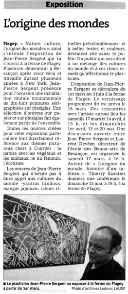 En marge de l’exposition « Cet obscur objet de désirs - Autour de L’Origine du monde » qui vient d’ouvrir ses portes au musée Gustave Courbet d’Ornans (dont il sera prochainement question dans ces colonnes), l’artiste plasticien franco-new yorkais Jean-Pierre Sergent est accueilli par la ville, à la galerie du Caveau des Arts (7, rue Saint-Vernier, Ornans) jusqu’au 13 juin.