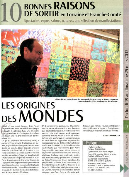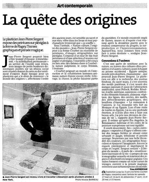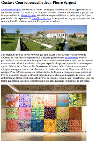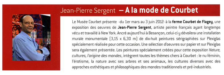 Artiste peintre franco-new-yorkais Jean-Pierre Sergent expose à l'international ses œuvres depuis plusieurs années, et c'est à Besançon qu'il a décidé de s'installer pour y vivre et y travailler. Inspirée des Upanishads, livre ancien de plus de trois mille ans et fondateur de la pensée Hindoue, cette exposition sera présentée lors de l'inauguration de l'exposition «Cet obscur objet de désirs autour de L'Origine du Monde», au Musée Courbet d'Ornans. Exposition qui montrera exceptionnellement le fameux tableau de Gustave Courbet : L'Origine du Monde.