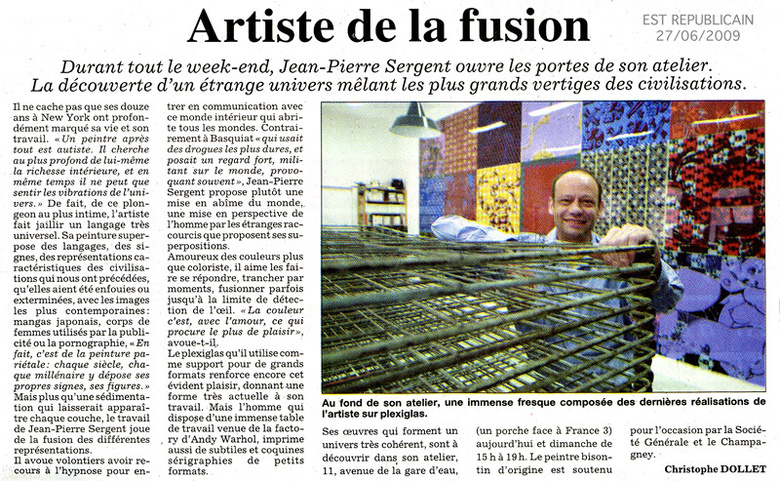 Jean-Pierre Sergent è un artista francese di 58 anni originario di Morteau. Dopo aver studiato architettura a Strasburgo e pittura presso L’école des Beaux-Arts di Besançon, cittadina dove tutt’oggi risiede il suo studio, ha vissuto a lungo nel continente americano, sia in Canada che negli Stati Uniti, in particolare a New York, dove vive e lavora alcuni periodi dell’anno.