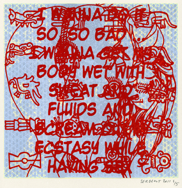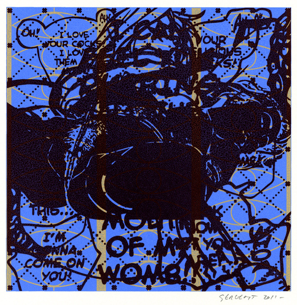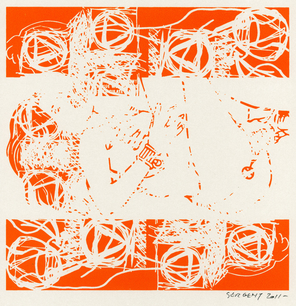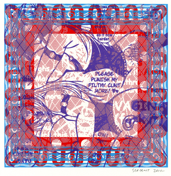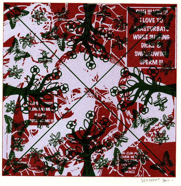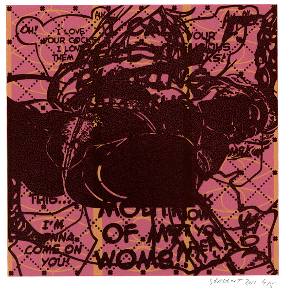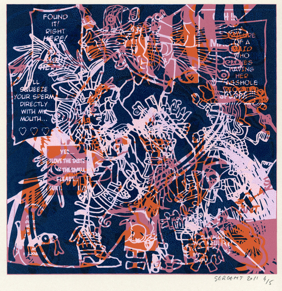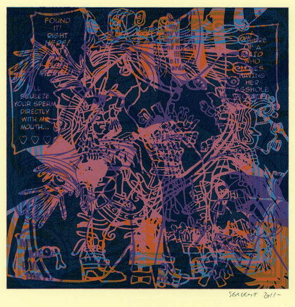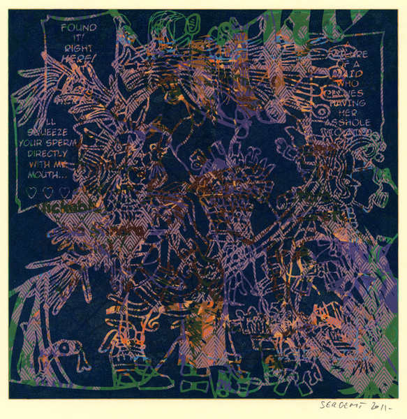 Rédemption par le vide, l'absurde et le sacré : le travail de Jean-Pierre Sergent est un travail d'embrouillage du langage pictural. Il utilise ses compressions iconographiques pour créer un système d'une grande entropie qui nous fait perdre nos repères spatio-temporels et nous emmène dans un monde onirique où l'art pariétal côtoie l'art populaire japonais, le graffiti urbain et le Yantra hindou. Sergent accumule, sans respect aucun, ni de la chronologie, ni de l'esthétique, ni de la morale, des images à la présence colorée et transcendante. Il nous parle de jouissances sexuelles et de transes spirituelles, là où les mots, les images et les langages finissent par se dissoudre pour accueillir cet autre monde. Lieu de passage et de vérité, son oeuvre nous enveloppe comme un sein, une matrice ou un rêve du premier et du dernier jour. C'est une réflexion sur la vie cyclique qui ne se soucie ni du temps qui nous abîme et nous blesse, ni des sentiments outrageants d'autrui. C'est la présence de l'être transposée dans le vide cosmique et la peinture sacrée. Jean-Pierre Sergent 10/2009