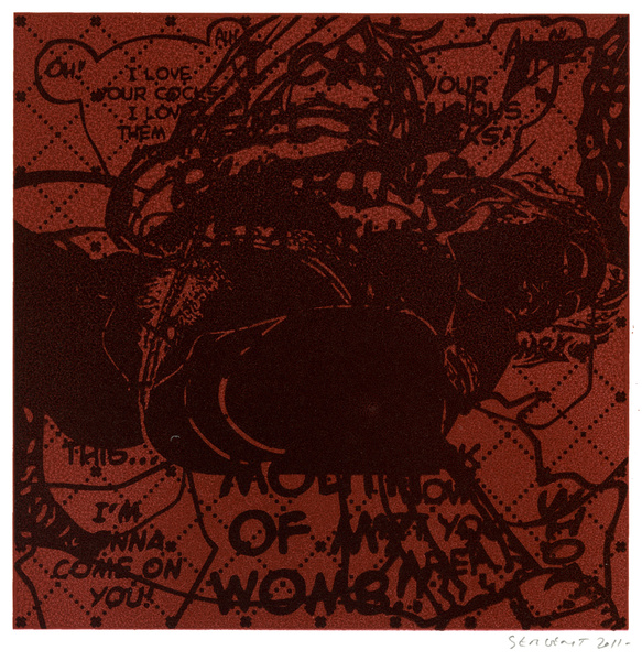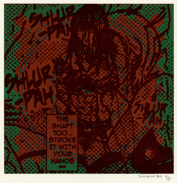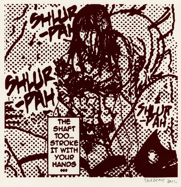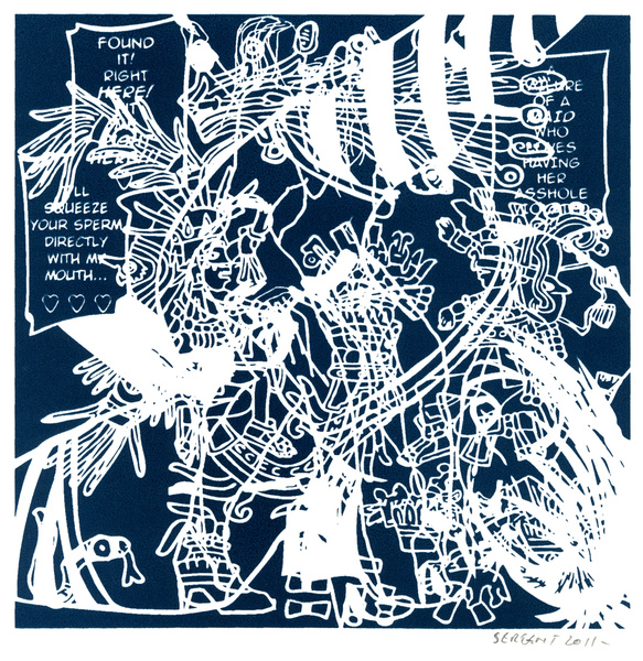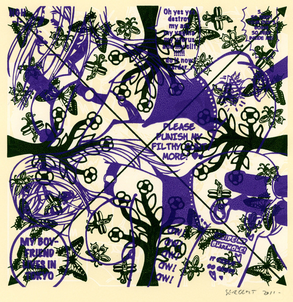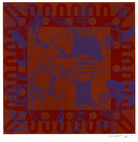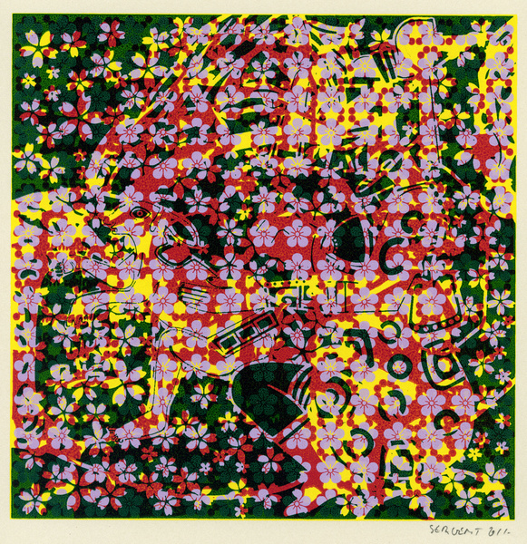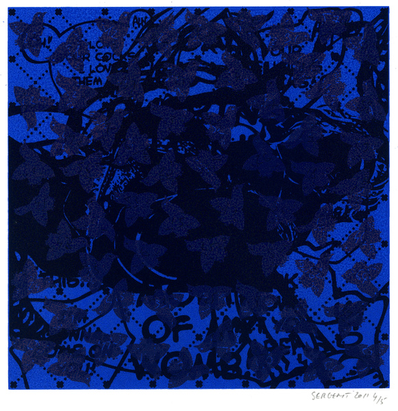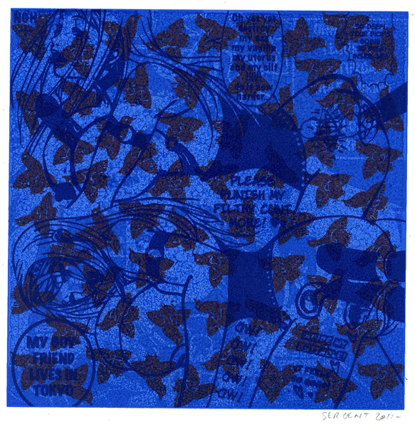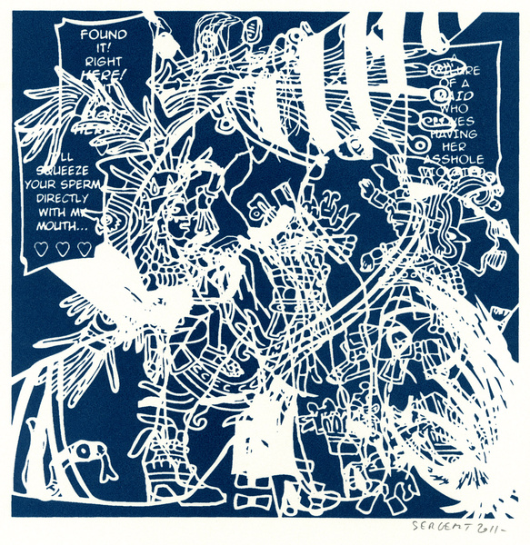 Rédemption par le vide, l'absurde et le sacré : le travail de Jean-Pierre Sergent est un travail d'embrouillage du langage pictural. Il utilise ses compressions iconographiques pour créer un système d'une grande entropie qui nous fait perdre nos repères spatio-temporels et nous emmène dans un monde onirique où l'art pariétal côtoie l'art populaire japonais, le graffiti urbain et le Yantra hindou. Sergent accumule, sans respect aucun, ni de la chronologie, ni de l'esthétique, ni de la morale, des images à la présence colorée et transcendante. Il nous parle de jouissances sexuelles et de transes spirituelles, là où les mots, les images et les langages finissent par se dissoudre pour accueillir cet autre monde. Lieu de passage et de vérité, son oeuvre nous enveloppe comme un sein, une matrice ou un rêve du premier et du dernier jour. C'est une réflexion sur la vie cyclique qui ne se soucie ni du temps qui nous abîme et nous blesse, ni des sentiments outrageants d'autrui. C'est la présence de l'être transposée dans le vide cosmique et la peinture sacrée. Jean-Pierre Sergent 10/2009