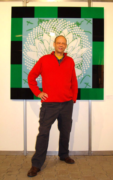 Jean-Pierre Sergent in front of the wall "Shamanic Ecstasies And Flowers" (3.15 x 6,30 m) at the group exhibition "L'artiste est-il un chamane ?". L'aspirateur, Narbonne, September 2016.