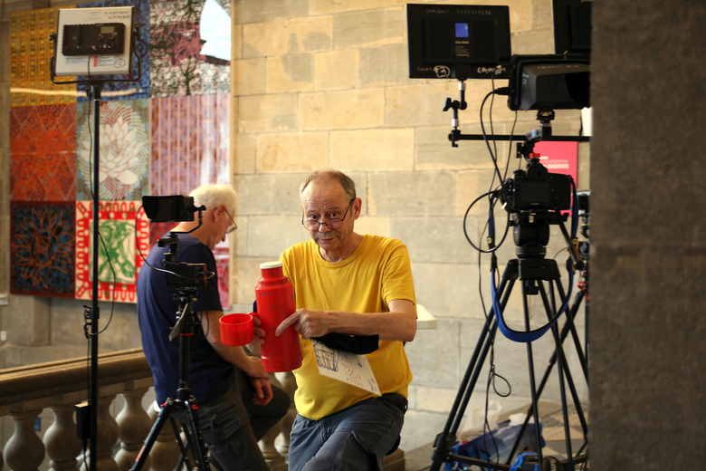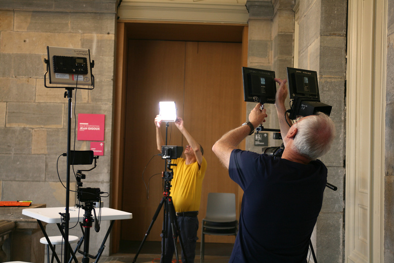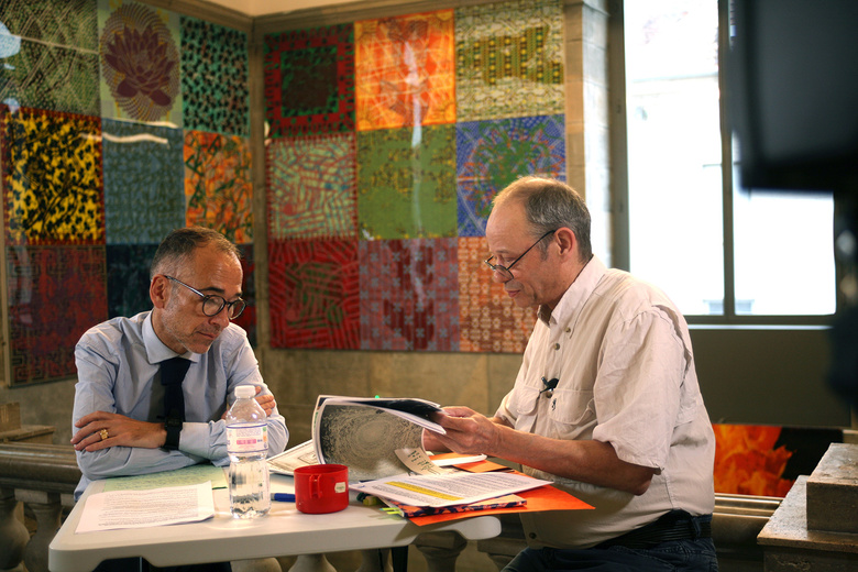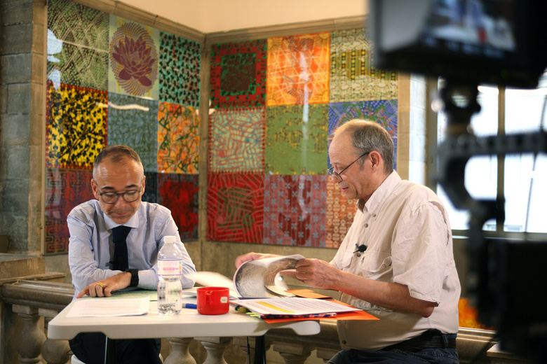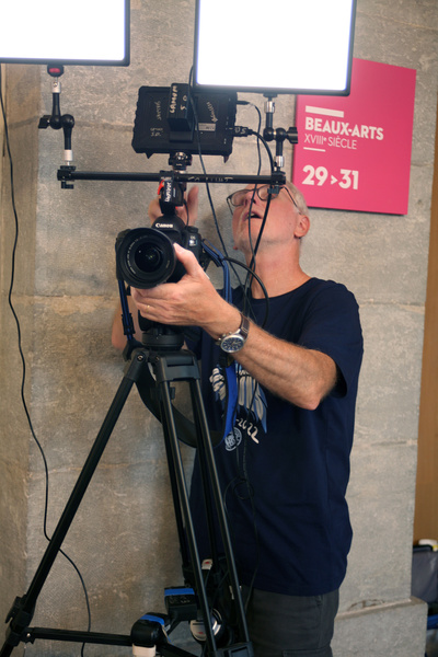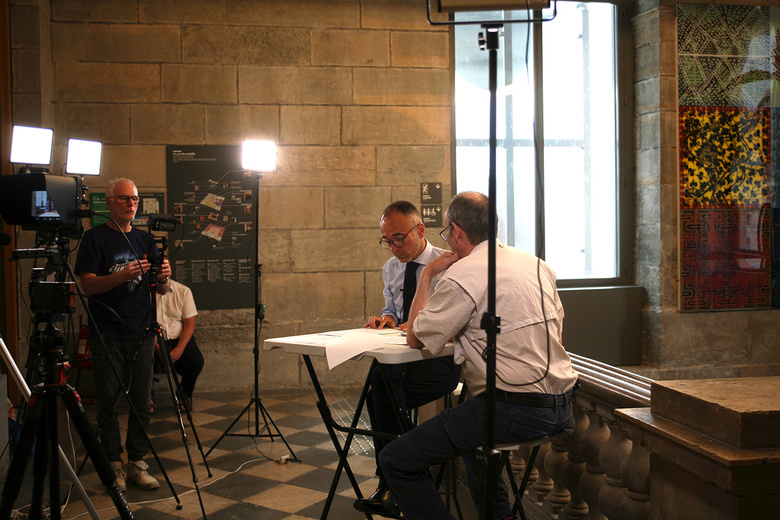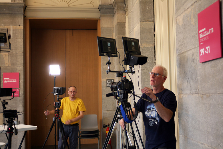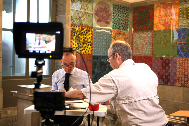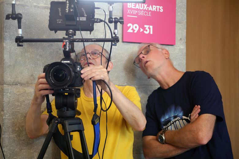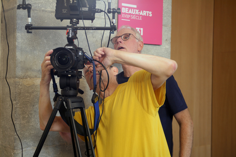 Photos of the filmed interview with artist Jean-Pierre Sergent and Thierry Savatier, Art Historian, at the MBAA of Besancon, July 2, 2021. Photos by Christine Chatelet, cameras by Lionel Georges.