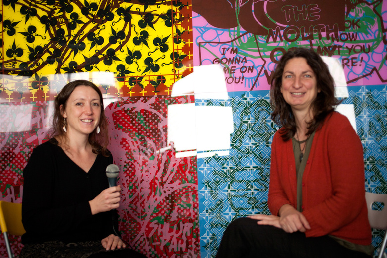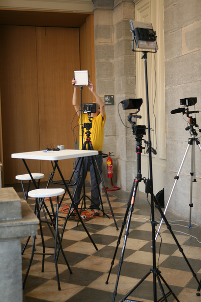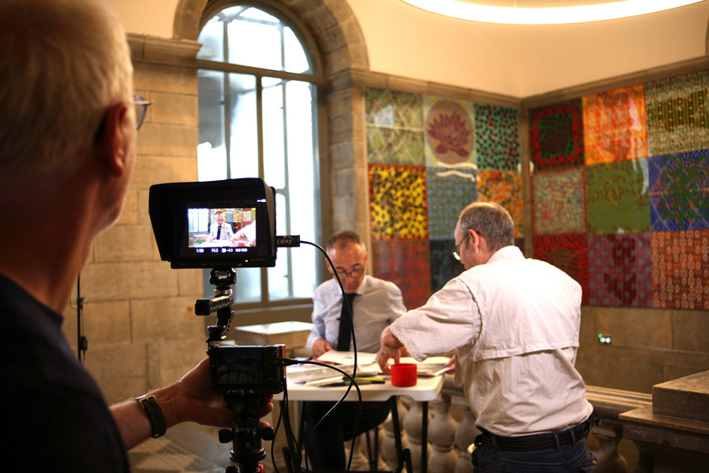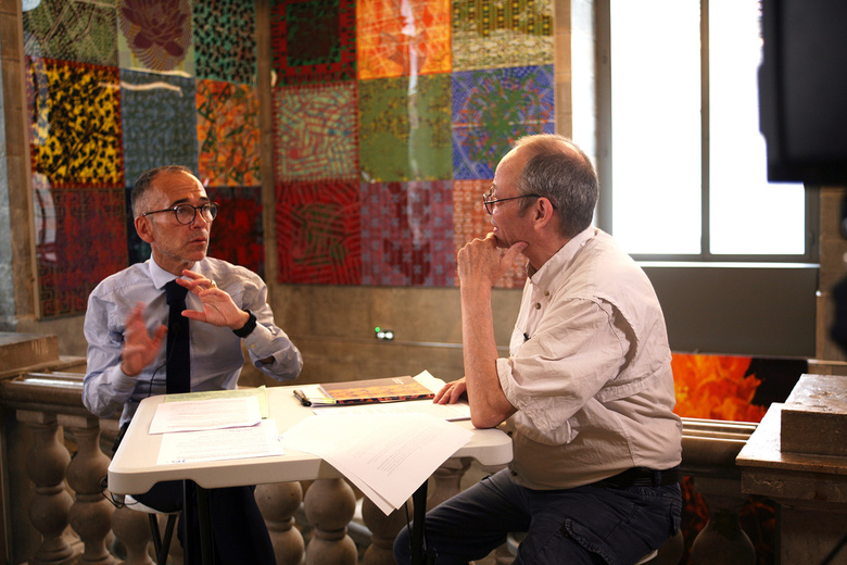 Photos of the filmed interview with artist, Jean-Pierre Sergent and Nicolas Surlapierre, director of the MBAA in Besancon, June 30, 2022. Photos by Christine Chatelet, cameras by Lionel Georges.