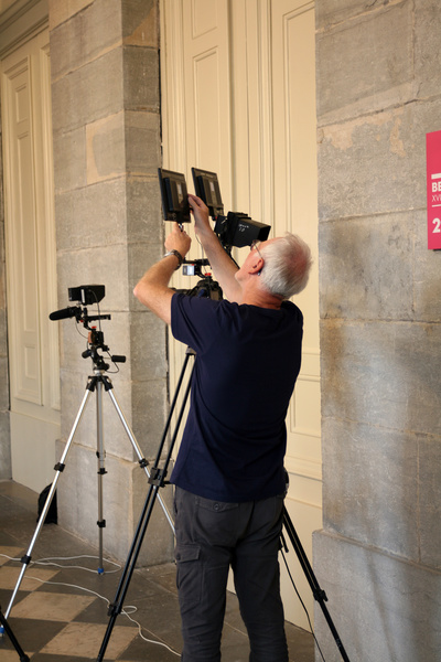 Photos of the filmed interview with artist, Jean-Pierre Sergent and Nicolas Surlapierre, director of the MBAA in Besançon, June 30, 2022. Photos by Christine Chatelet, cameras by Lionel Georges.