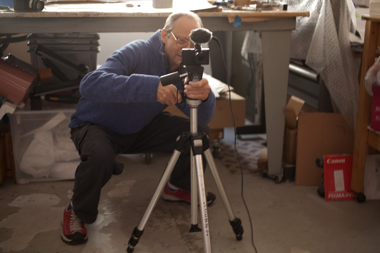 Photos of the filmed interview between Jean-Pierre Sergent and art historian Thierry Savatier, Art Historian, at the artist studio's in Besancon, July 29, 2019. Photos by Christine Chatelet, cameras by Lionel Georges.