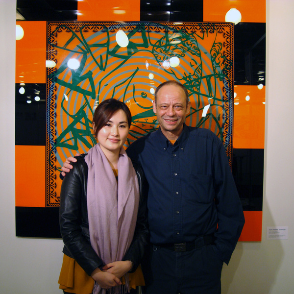 Shandelier Yu and Jean-Pierre Sergent front of the Orange Plexiglas Painting, MAG Montreux, Switzerland, November 2015, Photo by Jean-Pierre Sergent