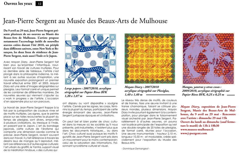 L’artiste plasticien Jean-Pierre Sergent, dont il a été question à plusieurs reprises dans ces colonnes, puise son inspiration dans la symbolique des cultures. Son procédé habituel, la sérigraphie sur papier ou sur Plexiglas, impose un travail en couches successives. Et ce sont, précisément, des couches successives de cultures qui se superposent dans ses créations. Graphismes aztèques ou mayas, yantras hindous, mais aussi mangas érotiques japonais se retrouvent ainsi interprétés sur une palette variée de couleurs souvent vives. L’énergie vitale qui en émane surprend les sens de l’observateur, lequel découvre, enfoui en lui, un rapport à l’univers aussi surprenant que singulier.