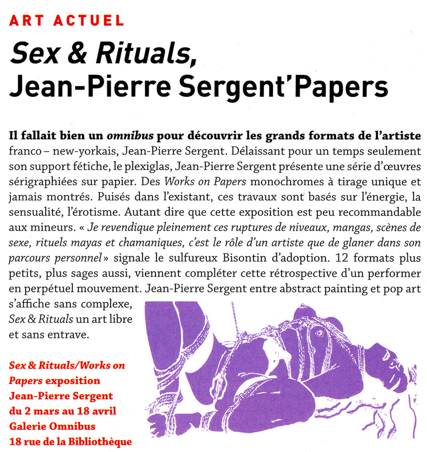 En marge de l’exposition « Cet obscur objet de désirs - Autour de L’Origine du monde » qui vient d’ouvrir ses portes au musée Gustave Courbet d’Ornans (dont il sera prochainement question dans ces colonnes), l’artiste plasticien franco-new yorkais Jean-Pierre Sergent est accueilli par la ville, à la galerie du Caveau des Arts (7, rue Saint-Vernier, Ornans) jusqu’au 13 juin.