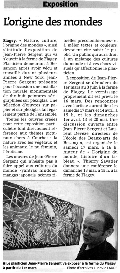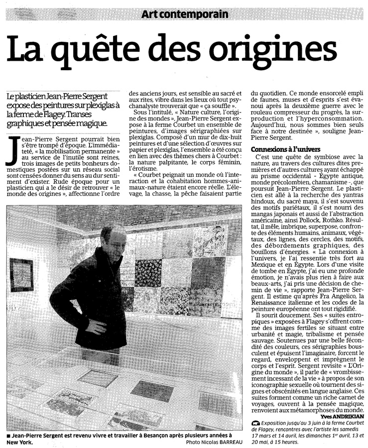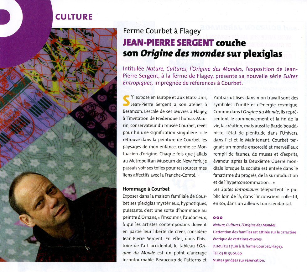 Artiste peintre franco-new-yorkais Jean-Pierre Sergent expose à l'international ses œuvres depuis plusieurs années, et c'est à Besançon qu'il a décidé de s'installer pour y vivre et y travailler. Inspirée des Upanishads, livre ancien de plus de trois mille ans et fondateur de la pensée Hindoue, cette exposition sera présentée lors de l'inauguration de l'exposition «Cet obscur objet de désirs autour de L'Origine du Monde», au Musée Courbet d'Ornans. Exposition qui montrera exceptionnellement le fameux tableau de Gustave Courbet : L'Origine du Monde.