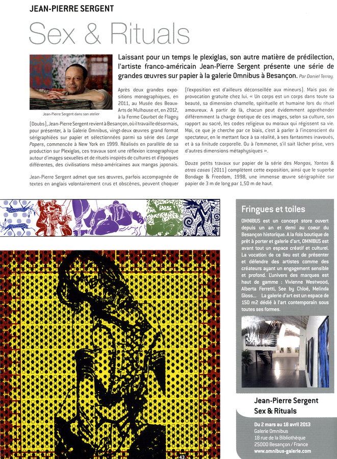 Le Kunstpalais de Badenweiler (Allemagne), non loin de Mulhouse, accueille actuellement, et jusqu’au 21 juillet 2013, une exposition réunissant une cinquantaine d’œuvres de Jean-Pierre Sergent, intitulée « Cultures Energies ». Parmi celles-ci, on notera particulièrement un grand travail sur papier, Bondage & Freedom (1,50 m x 3 m) et sept Plexiglas (1,40 m x 1,40 m).