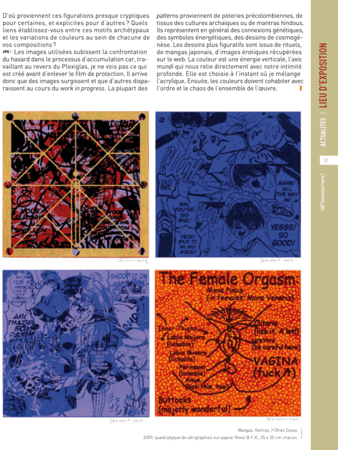 La technique sérigraphique de l’artiste lui permet de s’exprimer à travers la superposition de plusieurs couches de motifs, qui captent le regard du spectateur, lequel, au-delà de l’esthétique globale et complexe qu’il perçoit d’abord, se livre à un exercice de découverte, de décodage, pour in fine en lire toute la signification. Parfois aussi, l’œuvre parle d’elle-même, et s’offre comme une nouvelle étape de ce cheminement sans fin qu’est l’histoire de l’art. Ainsi en est-il du Plexiglas intitulé The Female Orgasm (2012), qui, sous une apparence très explicite, renvoie non seulement à L’Origine du monde par son cadrage fragmentaire, mais encore, à travers les textes qu’elle contient, à l’étonnante Infâme Vénus couchée de Jean-Jacques Lequeu (1779), exceptionnellement prêtée cet été au Musée Courbet.