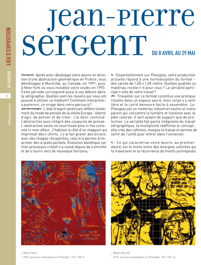 Il utilise la technique de la sérigraphie pour transférer ses images sur Plexiglas. « Je ne vois pas mon oeuvre. C’est un procédé qui libère l’esprit. Je travaille par couches successives. J’accumule et quand je sens qu’il se passe quelque chose, j’arrête ». Le processus créatif a ses raisons que la raison ne connaît pas. Chaque tableau s’apprécie individuellement, mais l’artiste réalise également des assemblages. C’est comme si les mots formaient des phrases. L’oeuvre monumentale qui tapisse le mur de son atelier semble avoir une incroyable histoire à raconter. La réputation de Jean-Pierre Sergent va bien au-delà de la Franche-Comté.
