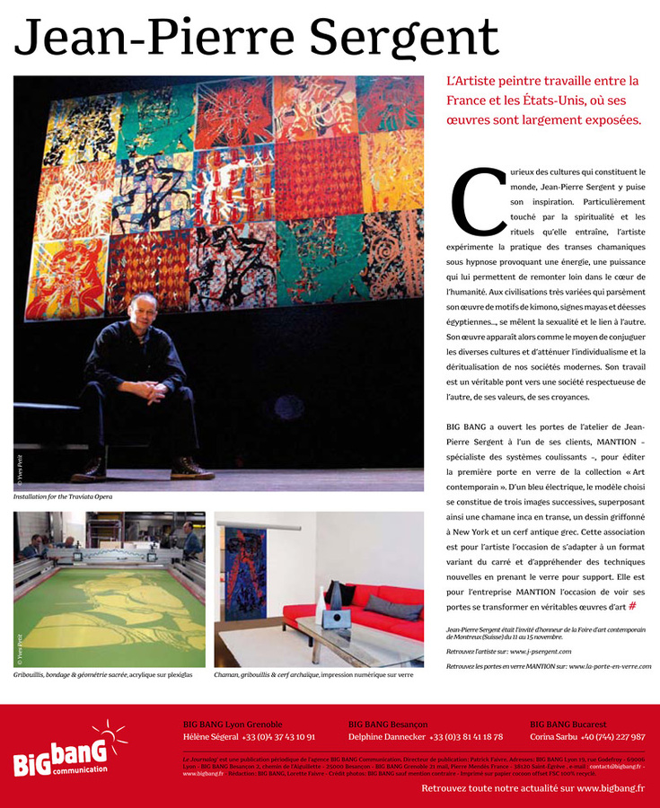 Jean-Pierre Sergent è un artista francese di 58 anni originario di Morteau. Dopo aver studiato architettura a Strasburgo e pittura presso L’école des Beaux-Arts di Besançon, cittadina dove tutt’oggi risiede il suo studio, ha vissuto a lungo nel continente americano, sia in Canada che negli Stati Uniti, in particolare a New York, dove vive e lavora alcuni periodi dell’anno.