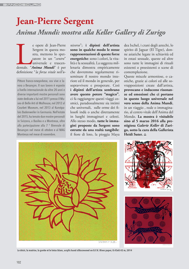 I am finishing the editing of the photos and videos we took during the summertime with my assistant Christine Chatelet, who filmed the working process in the studio. I have also to edit seven new interviews “Palabres dans l’atelier” with my philosopher friend Marie-Madeleine Varet. This spring, when the studio will get warmer, I will continue the printing of my series “Shakti-Yoni: Ecstatic Cosmic Dances”. I have several shows in the works for this year, some group exhibitions with the Keller Gallery, directed by Heidi Suter, in Zurich and the WOPART (works on paper fair) in Lugano, Switzerland. Also a large wall installation in a new Contemporary Art Center in Shenyang, then a solo show in Taipei, Asia. I hope to have a chance to exhibit my work in some new countries, particularly Japan, India or England.