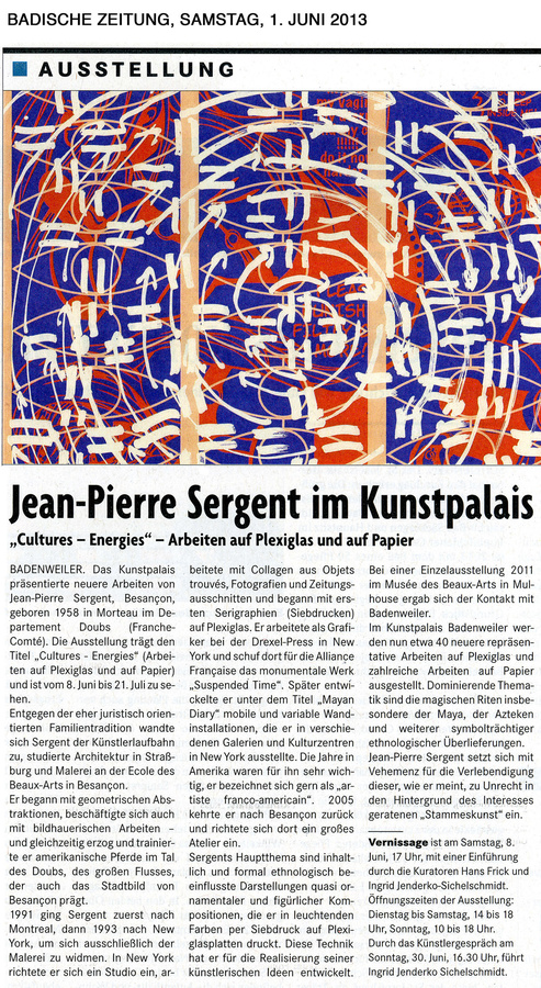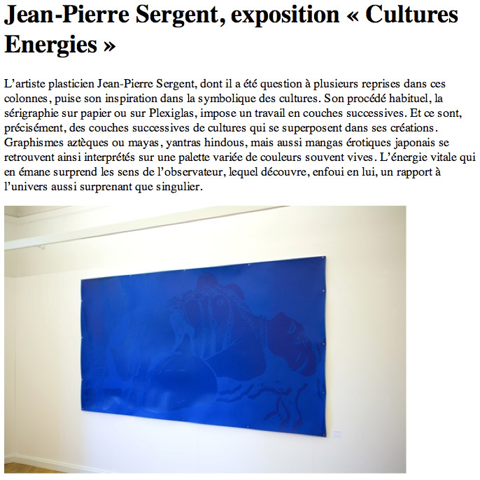 Un souffle de couleurs d'abord dont l'abstraction apparente brise l’austérité élégante du lieu. « Mes peintures, témoignent de la vie elle-même, sans détours, sans fards et sans fardeaux », écrit l’artiste. le regard s’attarde et le témoignage se précise. Jean-Pierre Sergent quête les rituels des civilisations premières. À travers des voyages d’abord, Mexique, Guatemala, Japon, Inde… « Tant qu'on en parle, elles ne disparaissent pas ! » Vivre une douzaine d’années à New York a façonné son rapport à l'art, à sa nécessité, alors que dans la vielle Europe « forte de son patrimoine, l’énergie a disparu sous le poids des deux guerres mondiales. Je veux voir autre chose, ce qui apporte de la joie, savoir qu’elle est possible ».
